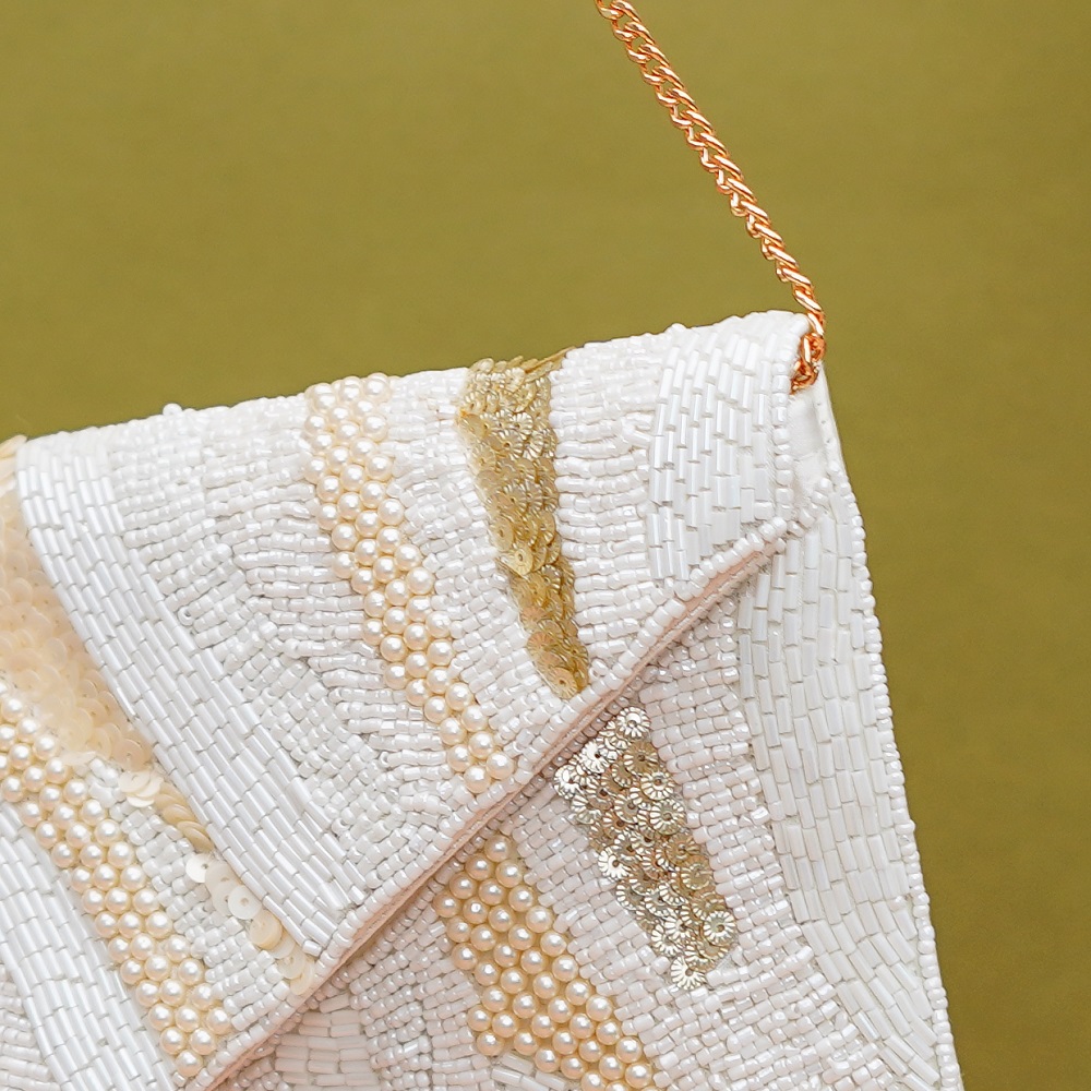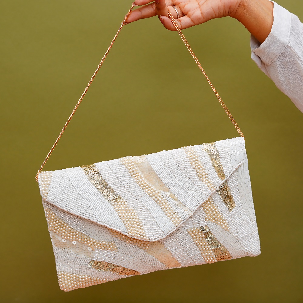 Radiate warmth and elegance with this stunning cotton and beads handbag. Designed in an envelope silhouette, the clutch features a graceful blend of golden, White, and ivory beadwork, forming abstract waves across the surface. The glimmering beads catch the light beautifully, giving it a glowing, golden-hour effect. Crafted from soft cotton, this bag pairs structure with comfort. The slim gold chain strap offers a touch of glamour, perfect for weddings, soirées, or festive evenings. Chic and timeless, this clutch adds effortless sophistication to any outfit.