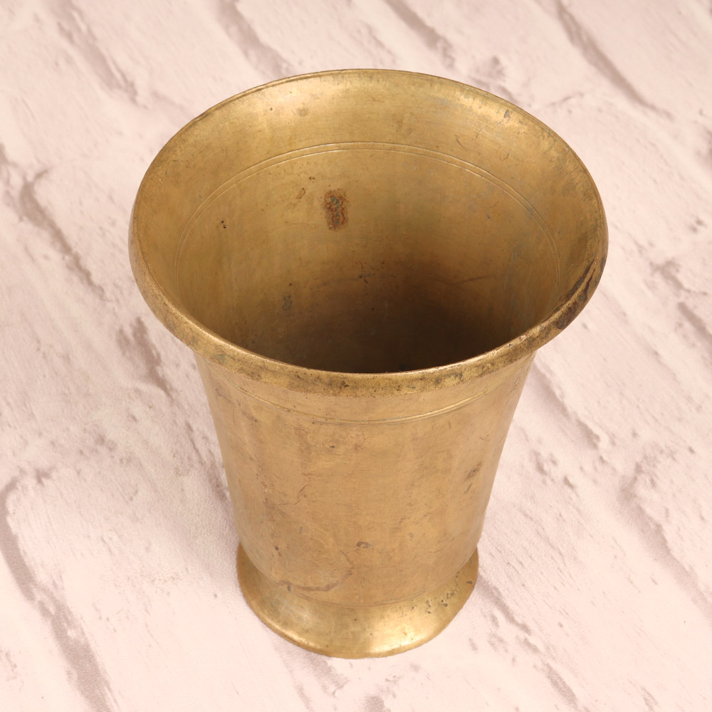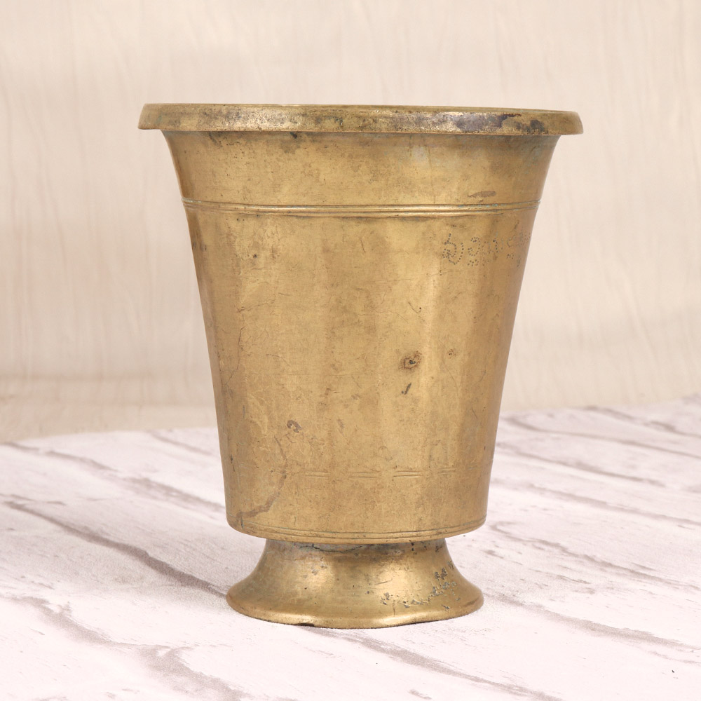 Discover the captivating allure of South Indian tradition with the Vintage Brass Holy Water Cup, a stunning work of art that seamlessly blends form and function. Crafted with meticulous attention to detail, this exquisite piece is a testament to the rich cultural heritage of the region, inviting you to elevate your home décor and rituals with its timeless elegance. Immerse yourself in the spiritual essence of South India by incorporating this Vintage Brass Holy Water Cup into your living space. Its earthy tones and captivating design will transform any room into a serene sanctuary, inviting you to pause, reflect, and connect with the wisdom of the ages. Whether used for ceremonial purposes or as a stunning visual centerpiece, this cup will become a cherished heirloom that tells the story of your cultural heritage. Ideal for spiritual seekers, interior design enthusiasts, and anyone drawn to the enchanting beauty of South Indian art, this Vintage Brass Holy Water Cup is a must-have addition to any discerning collection. Elevate your rituals, enhance your décor, and immerse yourself in the timeless allure of this exquisite piece – a true testament to the enduring artistry of South India.
