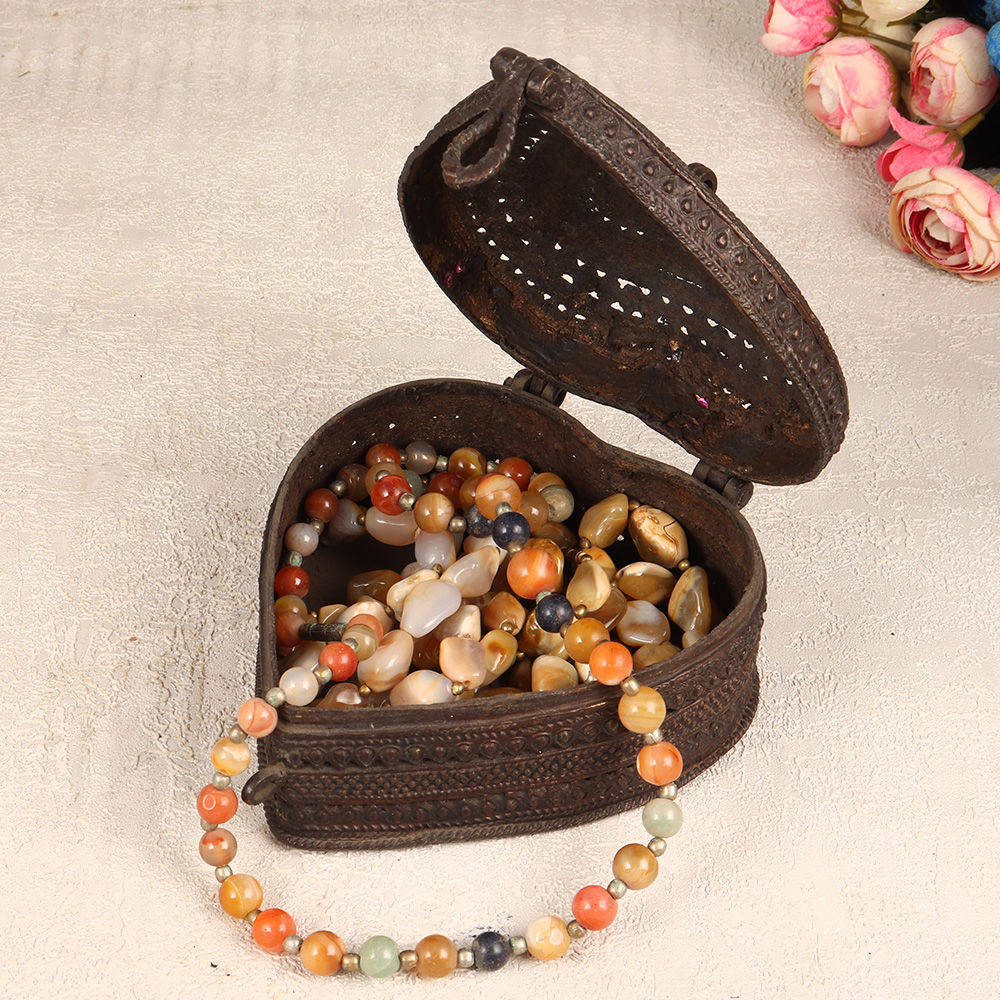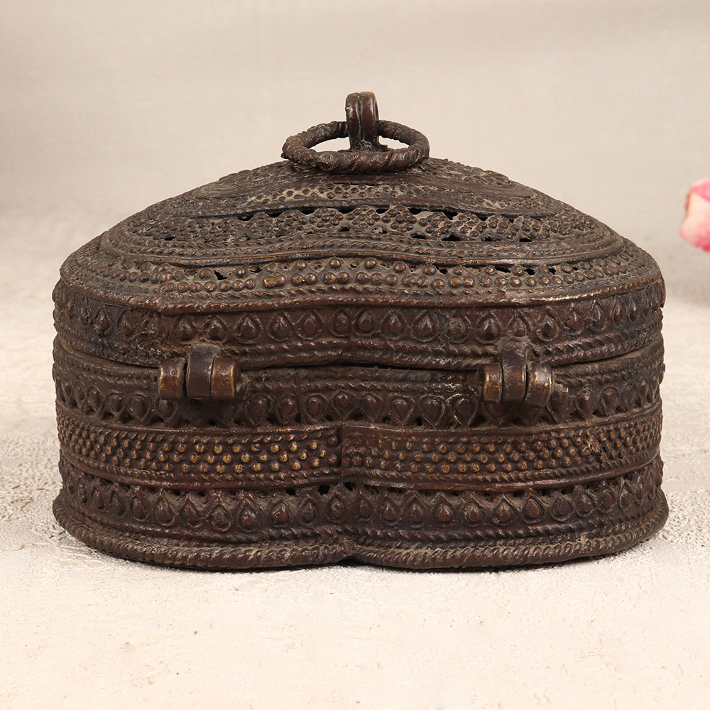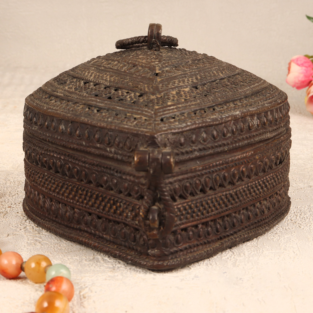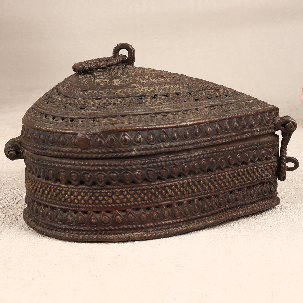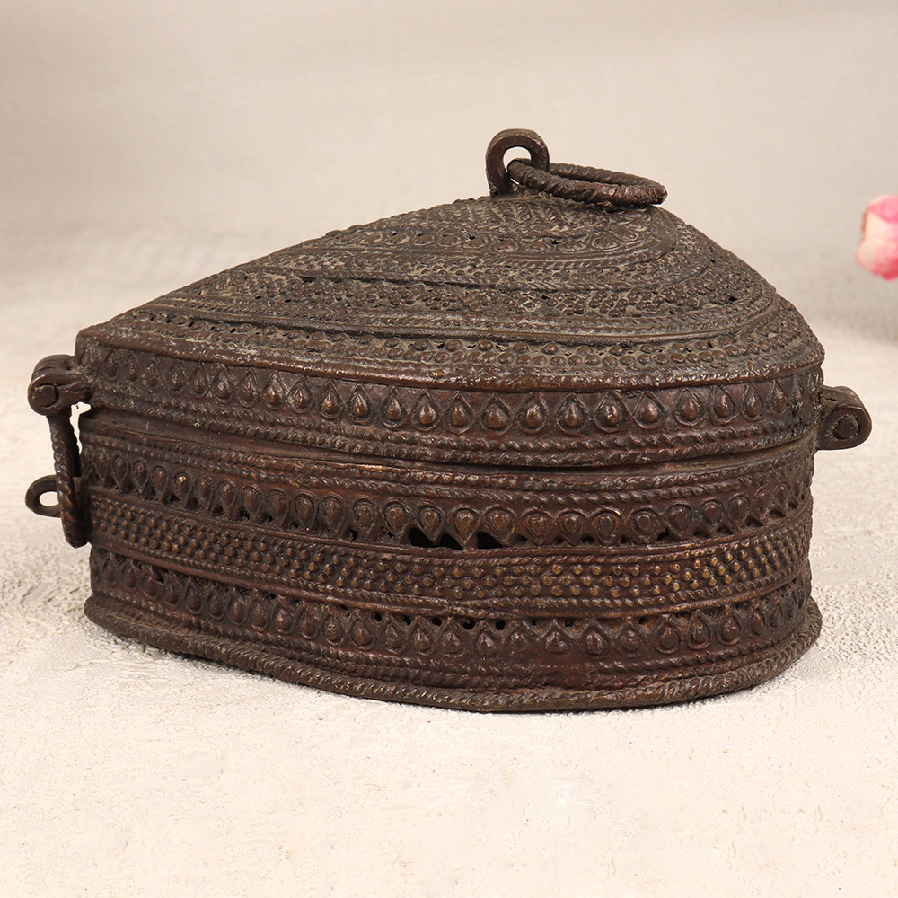Indulge in the timeless charm of our Vintage Brass Jewelry Box that is a heart-shaped masterpiece adorned with intricate engravings. Handcrafted by highly skilled Indian artisans hailing from the rich tradition of Odisha Art, this jewelry box is a testament to their expertise and passion for craftsmanship. Fashioned from high-quality brass, the box boasts a warm antique brown finish, adding a touch of vintage elegance to any space. The delicately engraved surface captures the essence of artistry, making it a captivating addition to your home, office, restaurant, hotel, or cafe. The latch secures your precious stones and jewelry, ensuring both style and functionality. This unique piece transcends mere storage; it becomes a conversation starter, effortlessly blending into any aesthetic while standing out with its distinctive design. Perfect for collectors, this jewelry box is a remarkable addition to a vintage ensemble. Its versatility extends to gifting, making it an ideal choice for special, festive, or auspicious occasions. Embrace the allure of tradition and craftsmanship with this Vintage Brass Jewelry Box which is a timeless treasure that transcends generations.