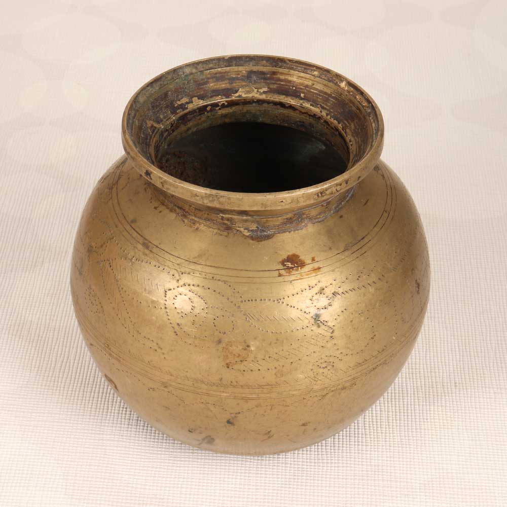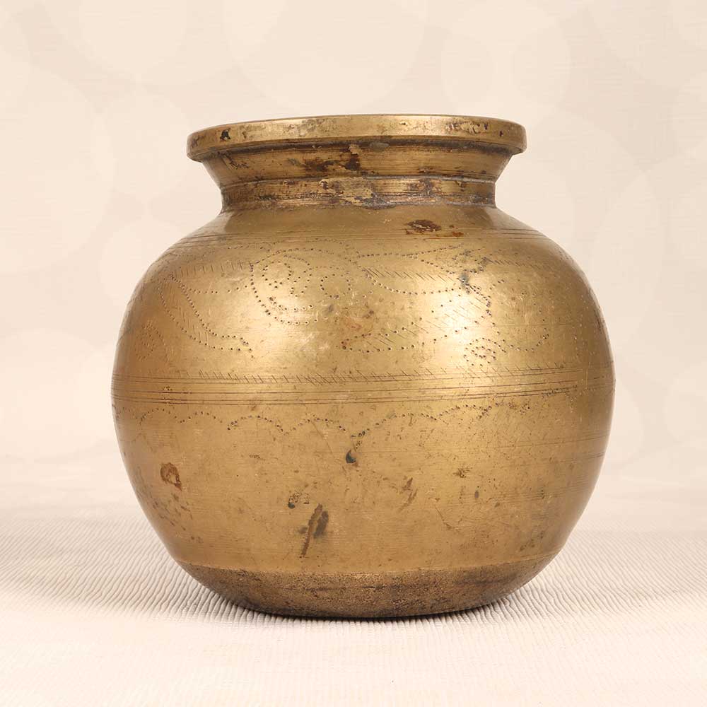 This antique brass holy water pot beautifully captures centuries of South Indian artistry and spiritual heritage. Its elegant shape and intricate engraving will add a touch of sacred grace to your home. The delicate engraving encircling this pot reflects the rich artistic tradition of South Indian metalware. Place your favorite blooms in this vessel to accentuate their beauty and perfume your home. During rituals or prayer, fill it with holy water to focus your intentions and connect with ancestral roots. With its antique styling and spiritual resonance, this brass holy water pot makes a meaningful addition to any home. Its graceful presence will draw the eye and invite comment from guests. For those who appreciate cultural artifacts, this pot provides a tangible connection to history. Let its beauty and heritage infuse your home with an elevated sense of meaning.
