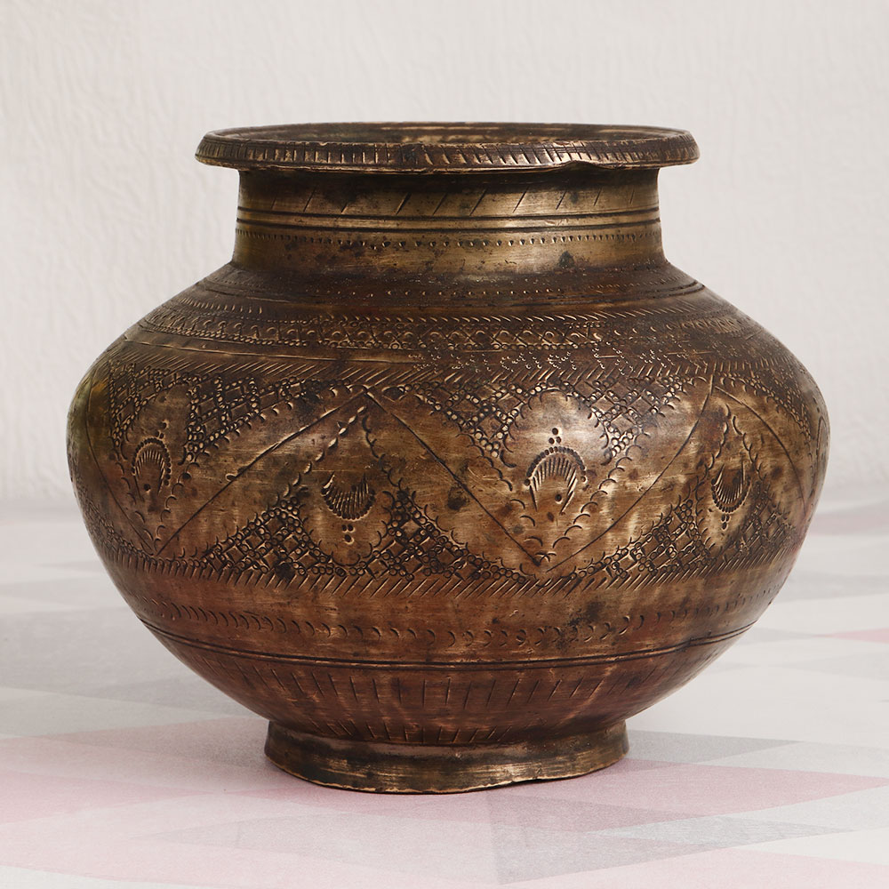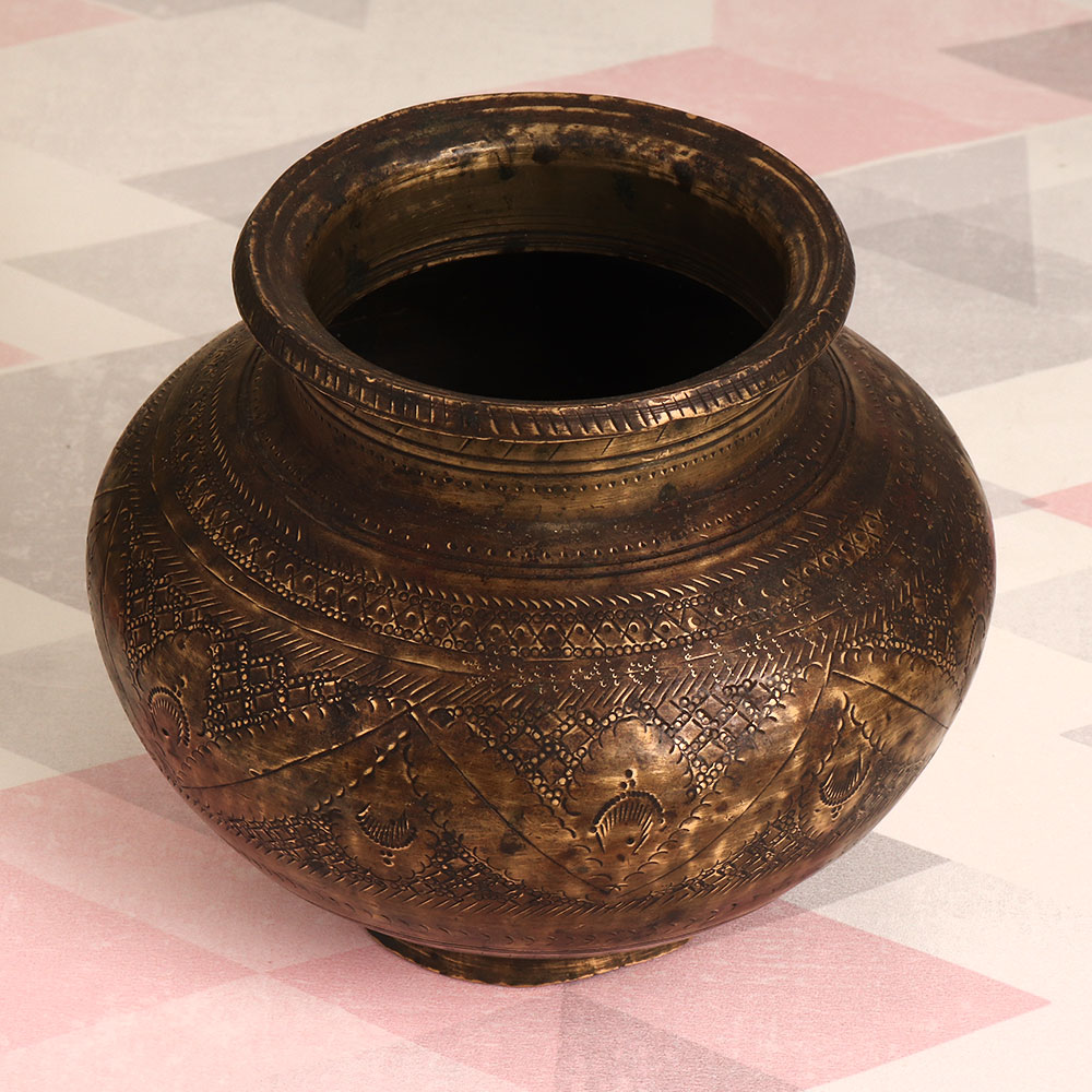 A Vintage Brass Holy Water Pot which is a testament to the craftsmanship of highly talented Indian artisans. Imbued with South Indian artistry, this piece is a fusion of beauty, tradition, and functionality. Crafted from high-quality brass, the pot boasts a stunning antique brown finish, adding an air of timeless elegance to any setting. Its intricate engravings tell a story of devotion and artistry, making it a work of art in its own right. This versatile piece can adorn your home, office, restaurant, hotel, cafe, or shop, gracing any space with its regal presence. As a flower pot, it brings the charm of vintage aesthetics indoors, housing your favourite blooms or succulents. Furthermore, it fulfills a sacred purpose by being a vessel for holy water during havans, rituals, and auspicious ceremonies. This dual functionality is a testament to its versatility. As a unique addition to your vintage collection or a thoughtful gift for your family, friends or relatives during special, festive, or auspicious occasions, this Vintage Brass Holy Water Pot is a treasure that encapsulates the essence of Indian craftsmanship and spirituality.