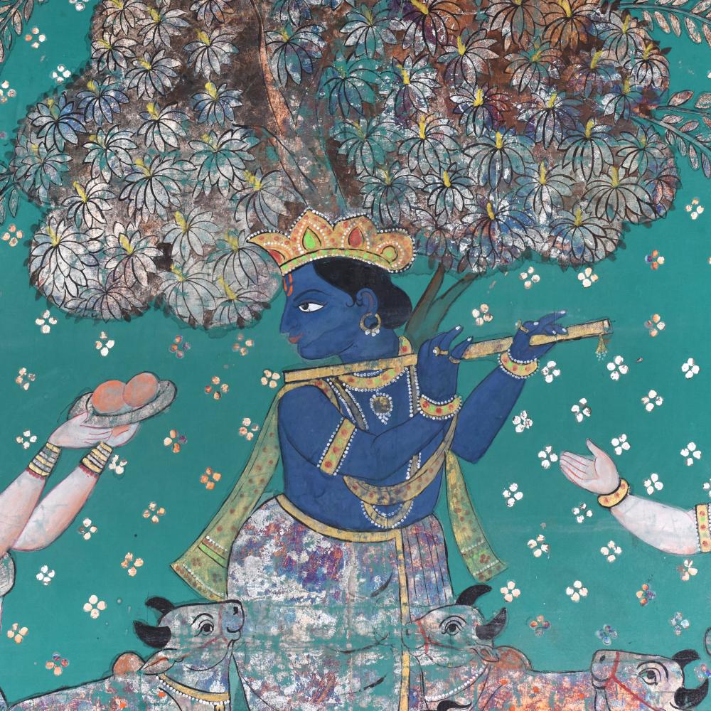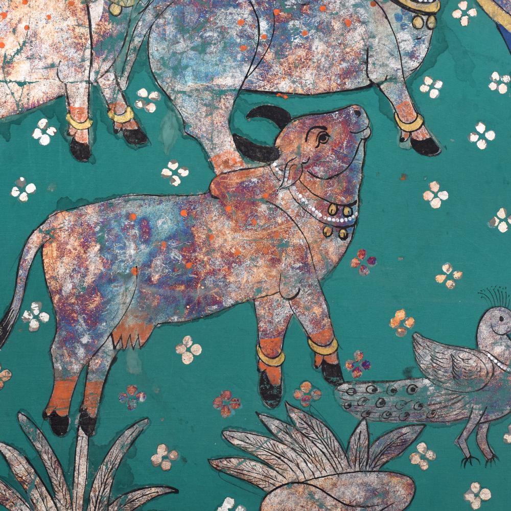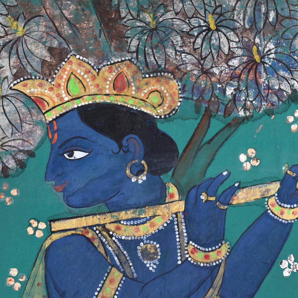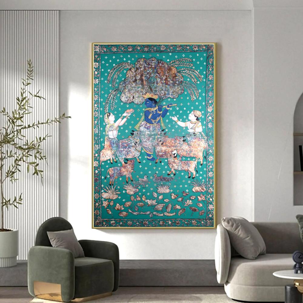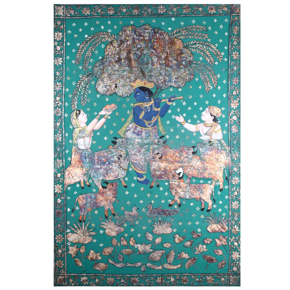 Elevate your space with the captivating beauty of this cloth pichwai painting without frame, featuring the beloved Lord Krishna in all his glory. Immerse yourself in the serene splendor of this meticulously crafted work of art, where the divine deity plays his enchanting flute amidst a herd of cows, framed by a lush, floral border. This pichwai painting is a true masterpiece, showcasing the exceptional skill and artistry of its creators. The level of craftsmanship is simply breathtaking, with each element of the design executed with the utmost care and precision. The vivid hues and mesmerizing details will transport you to the serene landscapes of Krishna's divine realm, inviting you to bask in the tranquility and inspiration of this sacred imagery. Whether you are a devotee of Lord Krishna or simply appreciate the beauty of Indian art, this pichwai painting is a must-have addition to your home. Display it as a stunning centerpiece, or use it to create a calming, meditative space. Either way, this exquisite work of art will elevate your surroundings and fill your heart with the timeless wonder of Krishna's eternal presence.