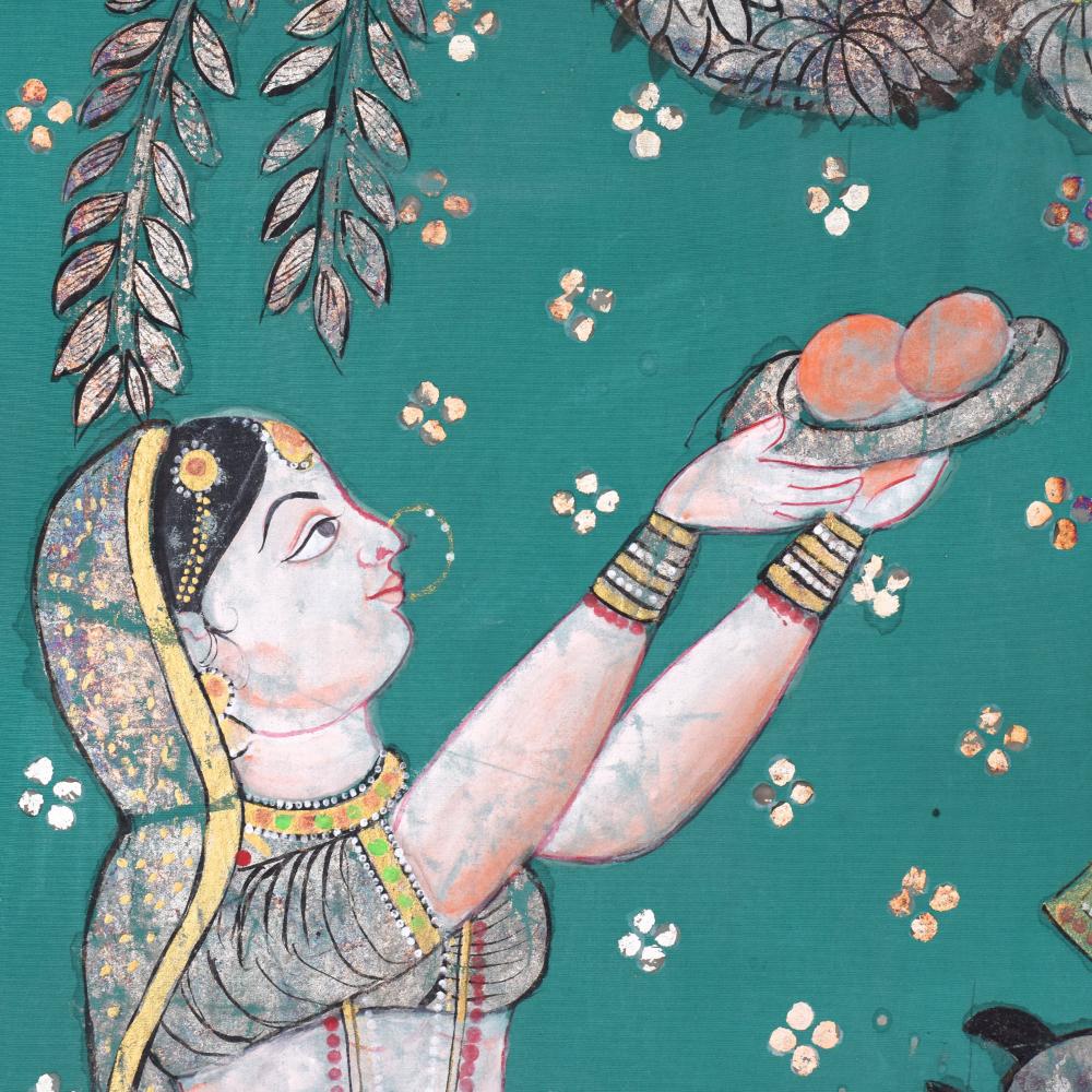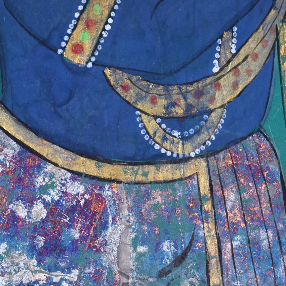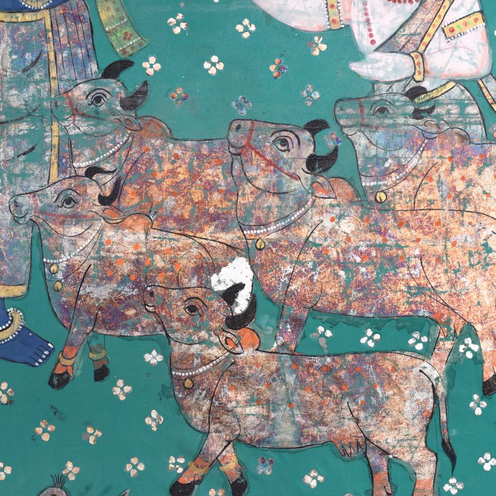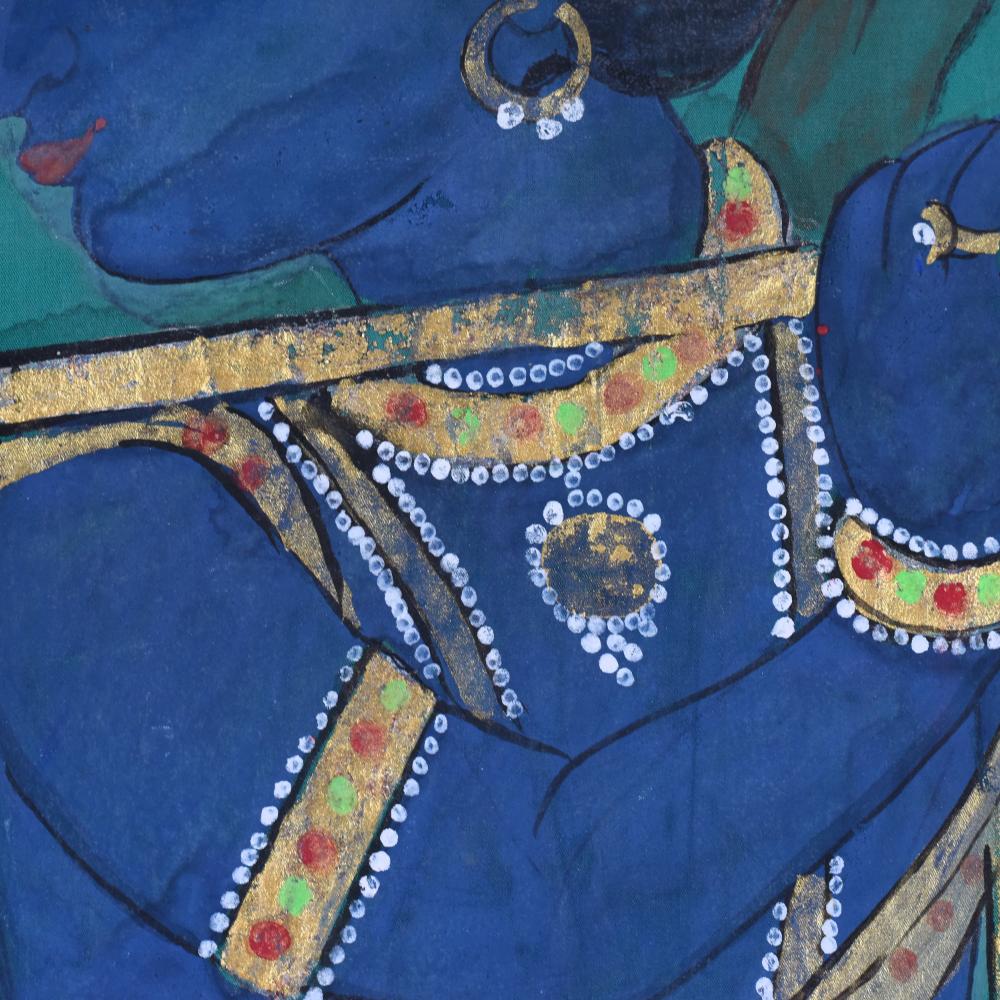 Elevate your space with the captivating beauty of this cloth pichwai painting without frame, featuring the beloved Lord Krishna in all his glory. Immerse yourself in the serene splendor of this meticulously crafted work of art, where the divine deity plays his enchanting flute amidst a herd of cows, framed by a lush, floral border. This pichwai painting is a true masterpiece, showcasing the exceptional skill and artistry of its creators. The level of craftsmanship is simply breathtaking, with each element of the design executed with the utmost care and precision. The vivid hues and mesmerizing details will transport you to the serene landscapes of Krishna's divine realm, inviting you to bask in the tranquility and inspiration of this sacred imagery. Whether you are a devotee of Lord Krishna or simply appreciate the beauty of Indian art, this pichwai painting is a must-have addition to your home. Display it as a stunning centerpiece, or use it to create a calming, meditative space. Either way, this exquisite work of art will elevate your surroundings and fill your heart with the timeless wonder of Krishna's eternal presence.