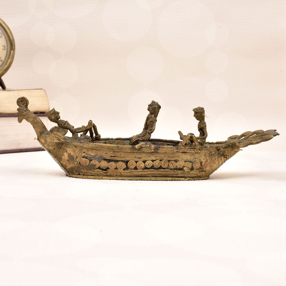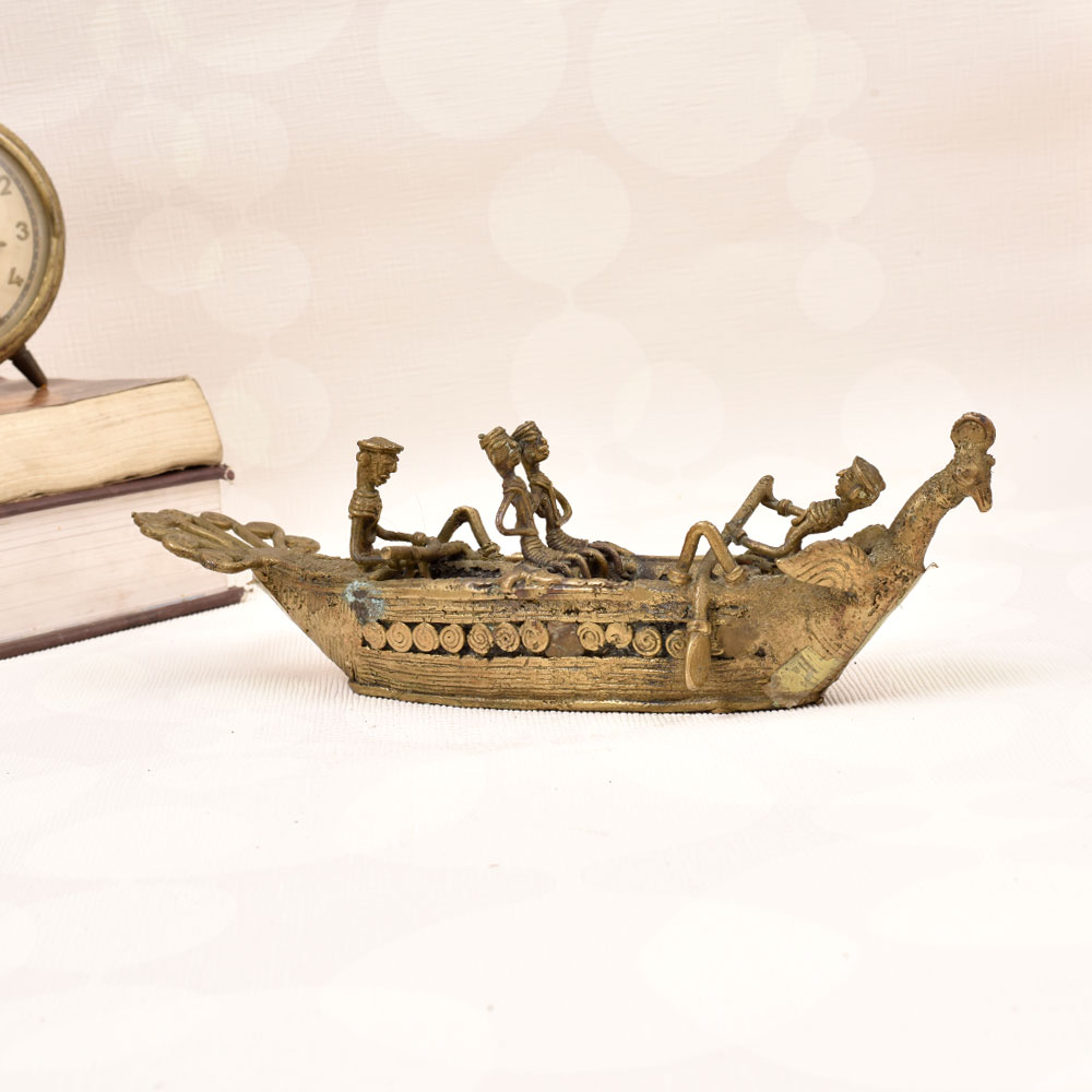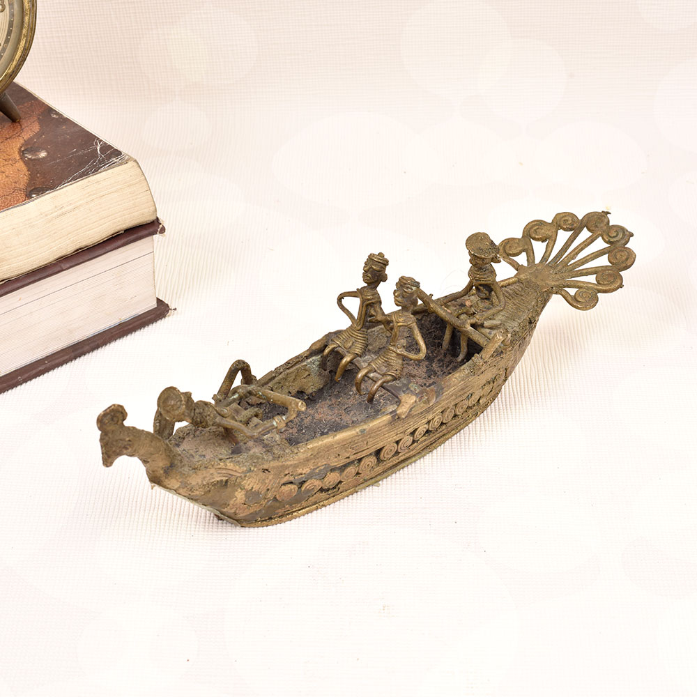 This breathtaking vintage brass boat statue will transport you to the tranquil waters of a faraway land. Expertly crafted with intricate tribal details, the piece features a striking peacock head and tail design that commands attention. Four small figures sit aboard the boat, adding to the sense of adventure and discovery. Whether displayed on your mantle, side table, or bookshelf, this heirloom-quality statue will elevate your home decor with its timeless beauty. The rich, gleaming brass construction ensures it will maintain its luster for years to come. It's a unique conversation piece that celebrates the artistry and craftsmanship of traditional tribal cultures. Bring the serene, nature-inspired elegance of the open seas into your living space. This vintage brass boat statue is a must-have for anyone who appreciates fine home accents that tell a story. Display it proudly and let it transport you to distant, enchanting shores.