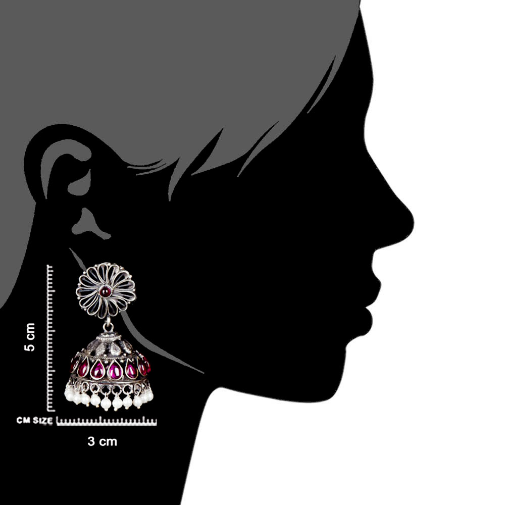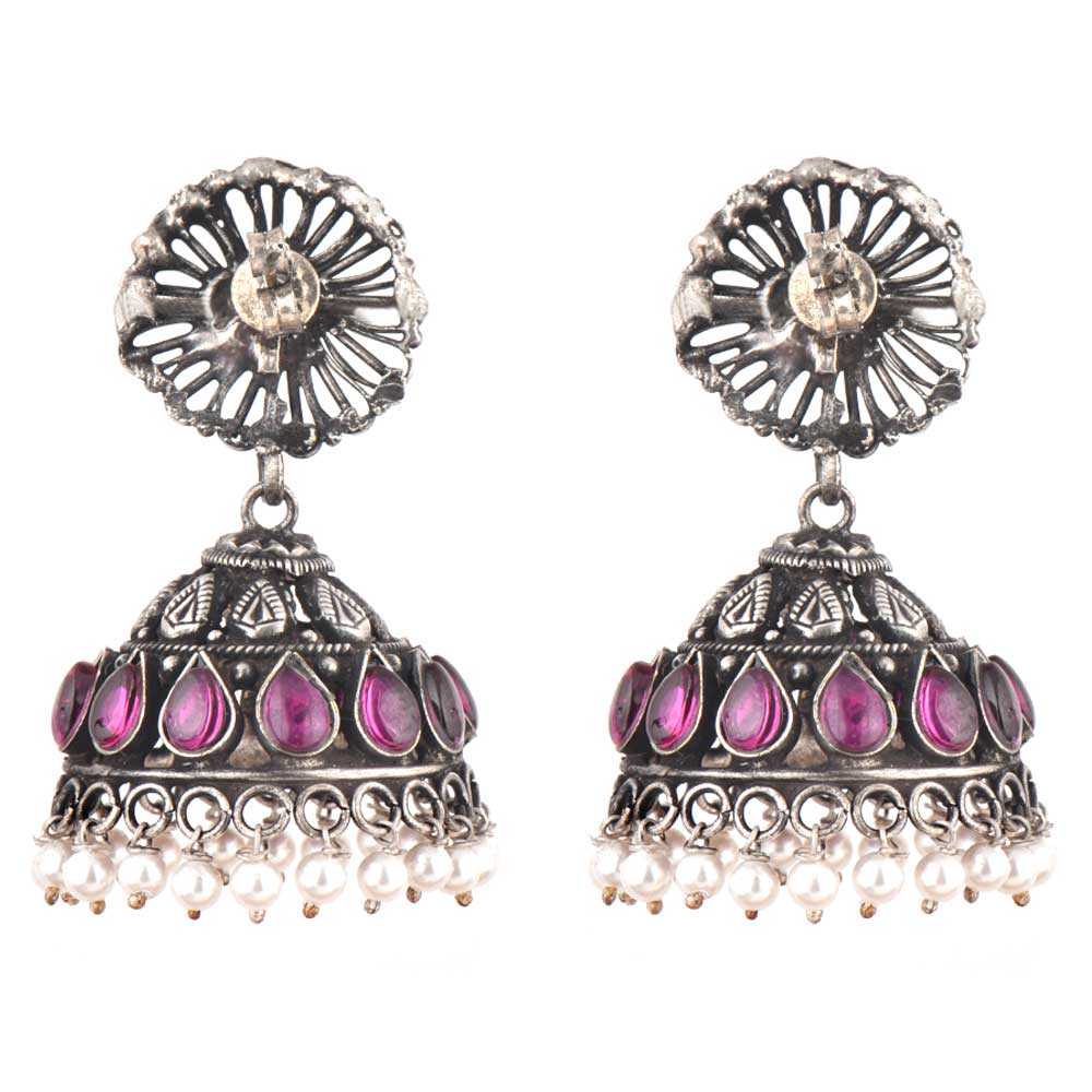 Big floral stud made in 92.5 Sterling silver jhumki with amethyst stones on the jhumki with pearl beads tassels. Wear it at party, engagement ceremony, daily wear, office wear and birthday party . Gift it to yourself or your near and dear ones.