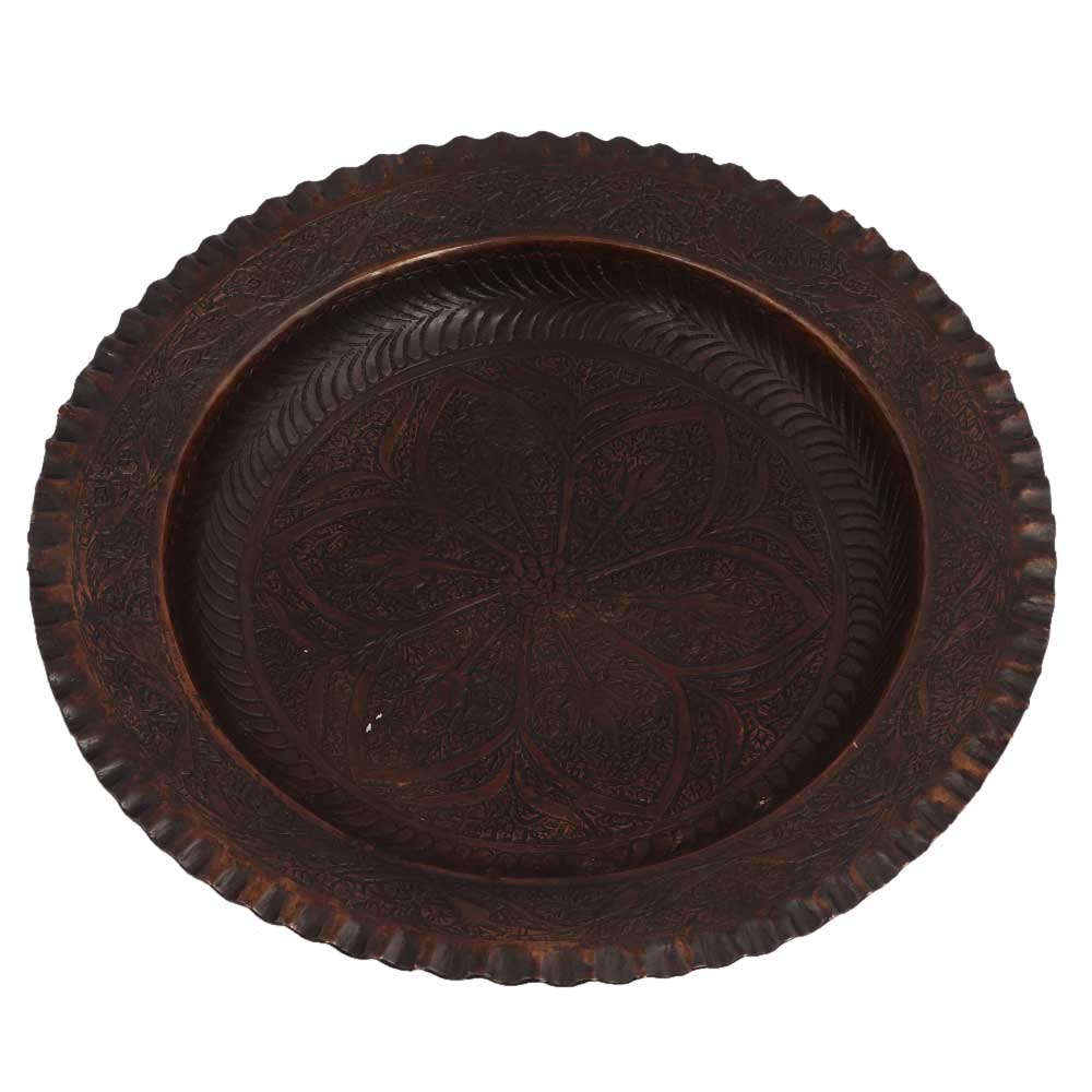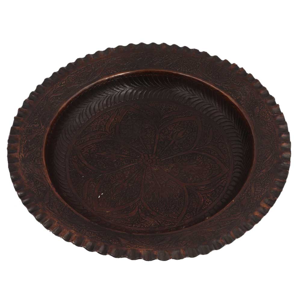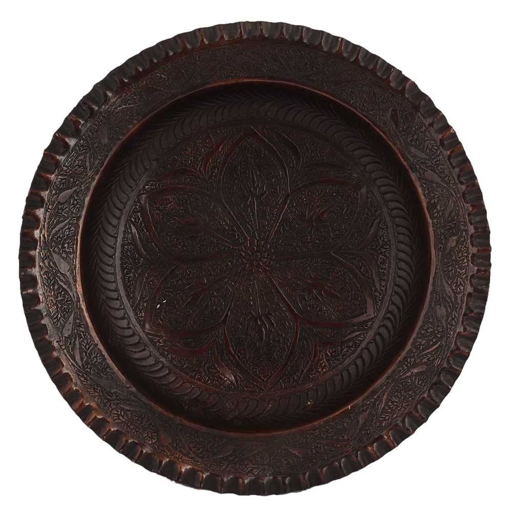 Old Brass Plate has a beautiful Flower and leaf design in the centre and diamond design. The exterior has a beautiful roped type trim around the entire tray. Makes an Excellent wall hanging and home decor product.