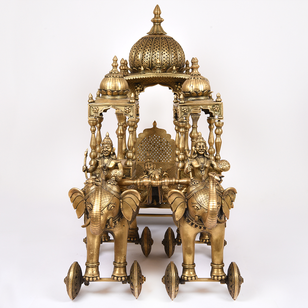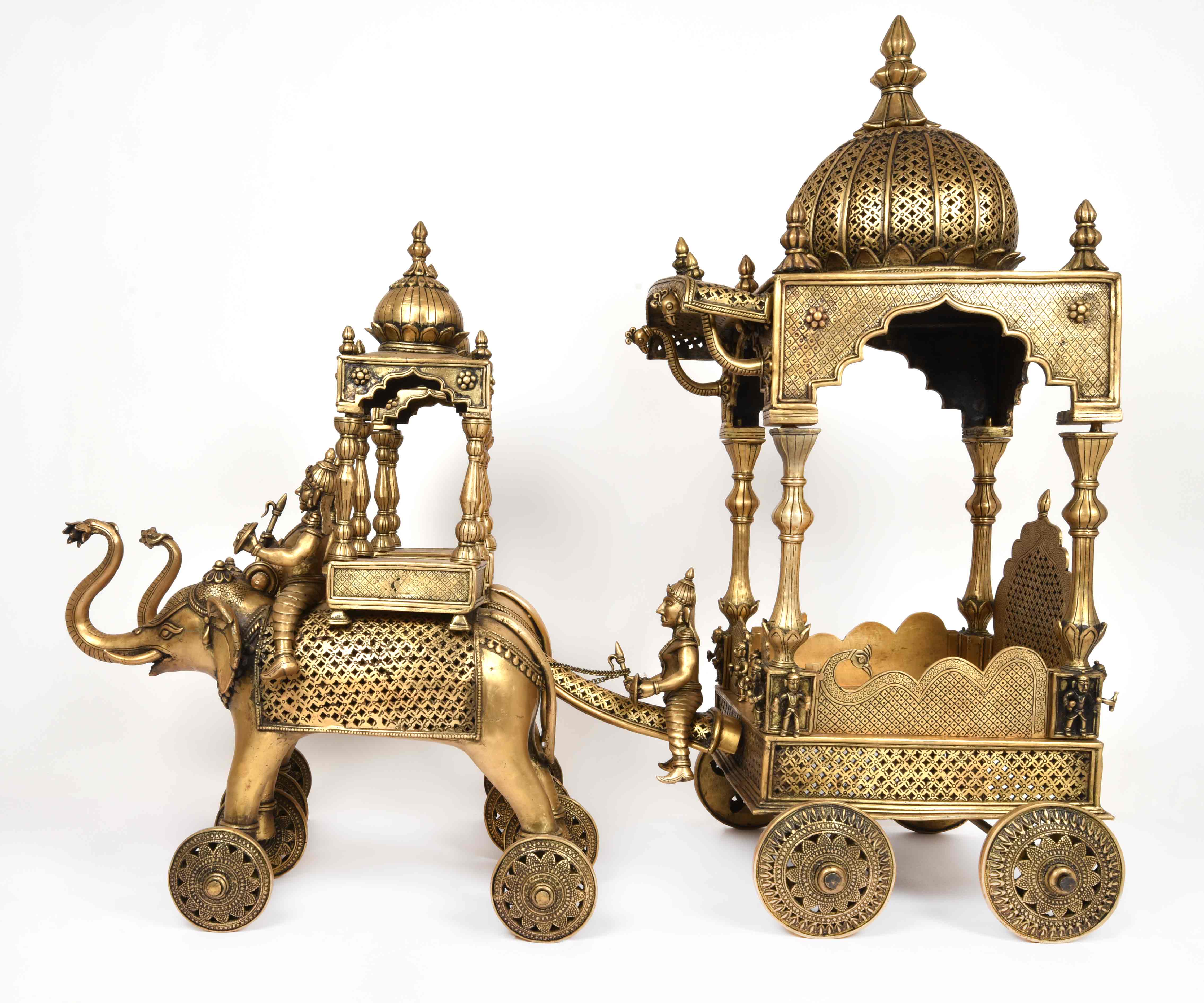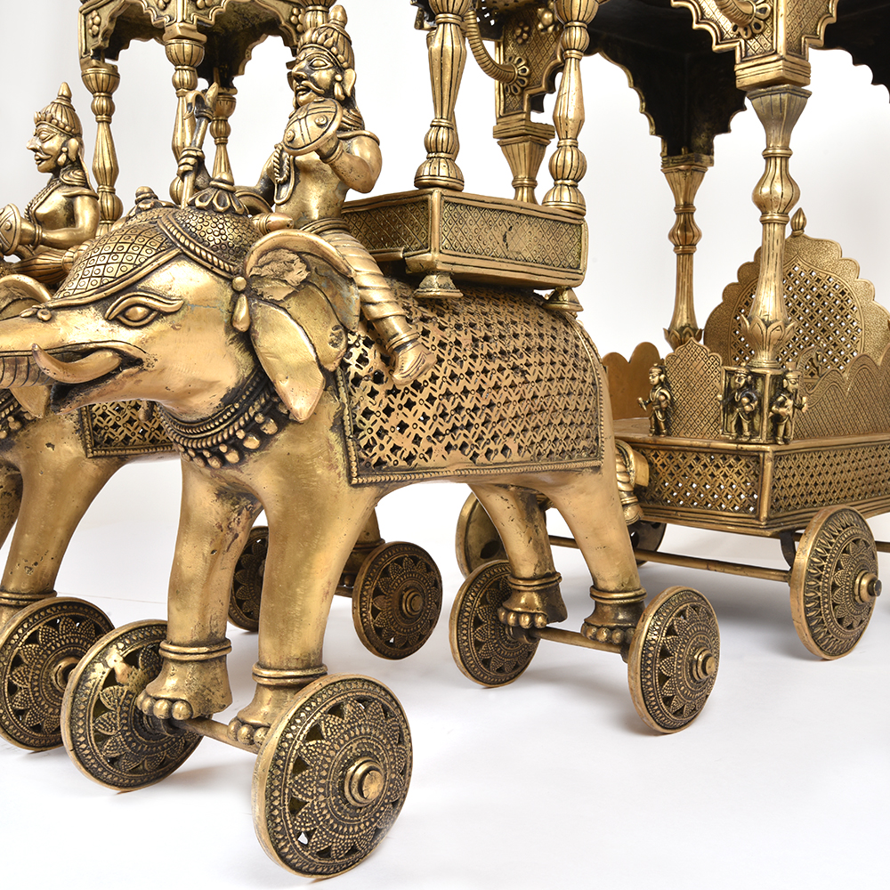 Big Size Golden Bronze Carriage Driven with Two Bronze Elephant and Coachmen on Wheels.