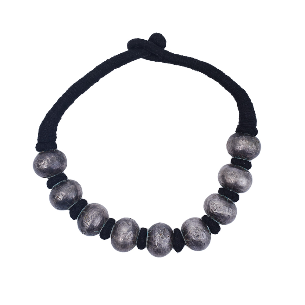 With base metal and a silver oxidized finish, this long necklace was handcrafted in India using large handmade beads and thread. This jewelry set, with its elegant vintage aesthetics, is eye-catching and made for all occasions. These look great with any complementary outfit and are appropriate for both traditional and western events. Jewelry with a one-of-a-kind design that adds color and style to your outfit and attracts attention the moment it is worn. For someone you love the most on their birthday, anniversary, or Valentine's Day, give a woman a gift. is commonly worn by girls and women. The style, which is frequently influenced by traditional looks, can be worn with a wide range of outfits for a wide range of occasions.