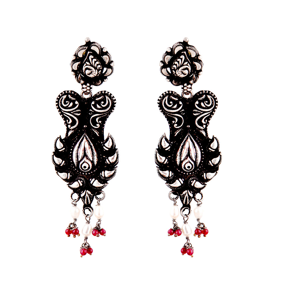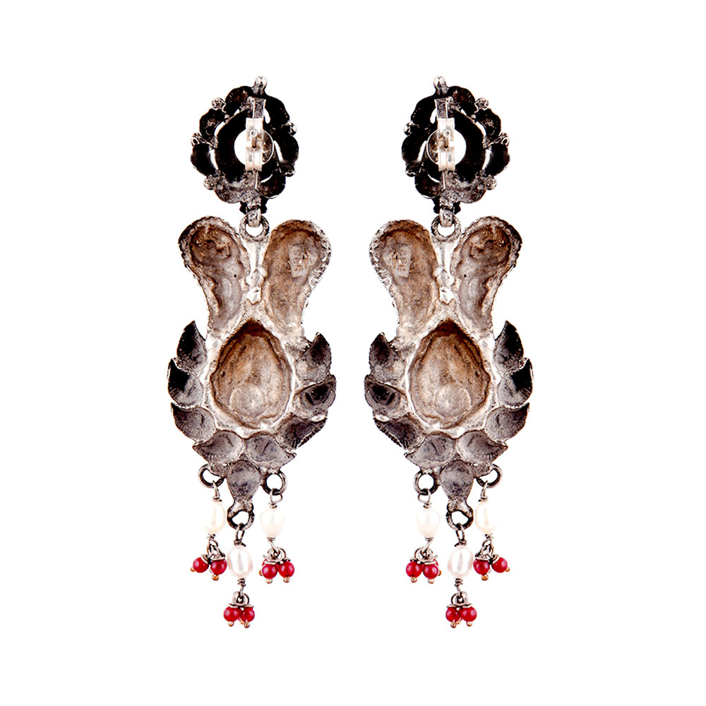 A very unusual 92.5 sterling silver earrings black oxidized color Floral pattern on the stud and conch motifs on the dangler added color with red coral bead hanging on the bottom. Wear it yourself or gift to your near and dear ones on cocktail, reception, baby shower or birthday.