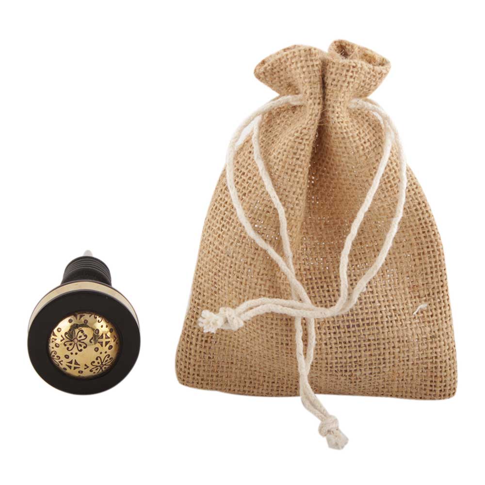 Black And Golden Brass Tiny Flower Resin Wine Stopper. Zinc Alloy Wine Bottle Stopper with Attractive Jute Bag Packaging.