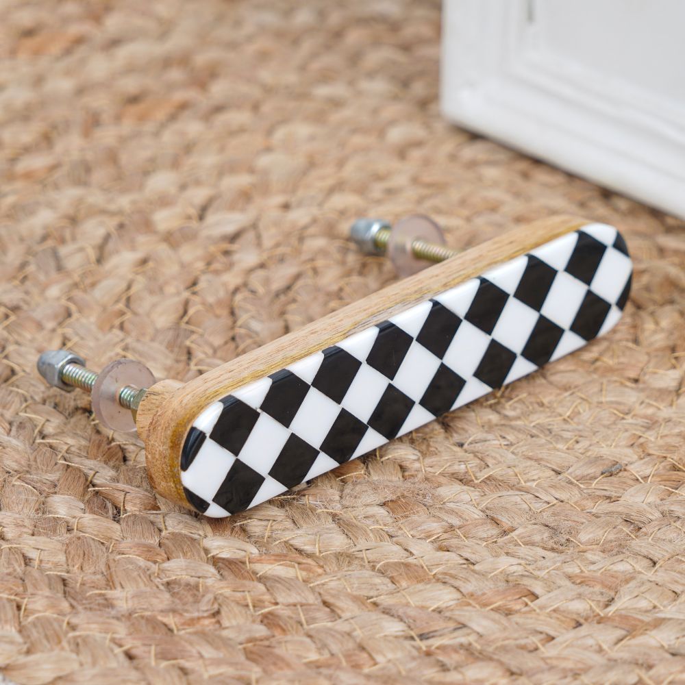 The black and white checkerboard design fits seamlessly into a range of interiors, from sleek modern spaces to eclectic or vintage-inspired rooms. Whether you're giving your space a fresh look or simply updating your furniture, this handle is a perfect choice.