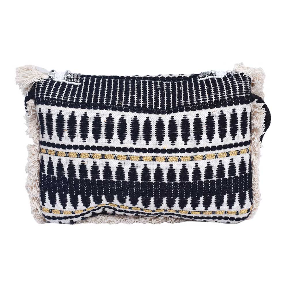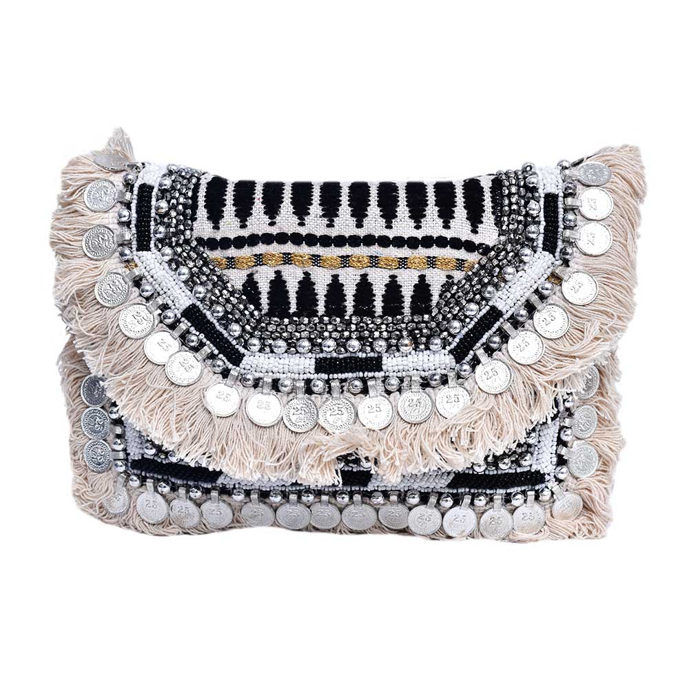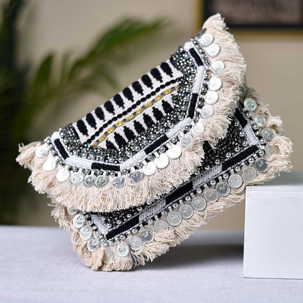 This handcrafted Boho bag is the ideal arm candy and looks stylish when worn with both western and ethnic festive outfits. With metallic beads, coins, thread tassels, and fringe detail on the sides, this timeless black handbag with a sling is hand embroidered. The bag has a magnetic snap button and a flap. With these as a clutch or cross body bags with your modern outfits for a fun Boho vibe, spice up your festive look.