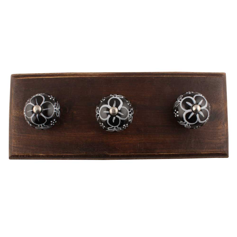 Material: Solid Natural wood base with hand-painted black ceramic knob Finish: Glossy glazed ceramic with white floral pattern; matte-sealed Natural wood Installation: Hidden mount with included screws and drywall anchors