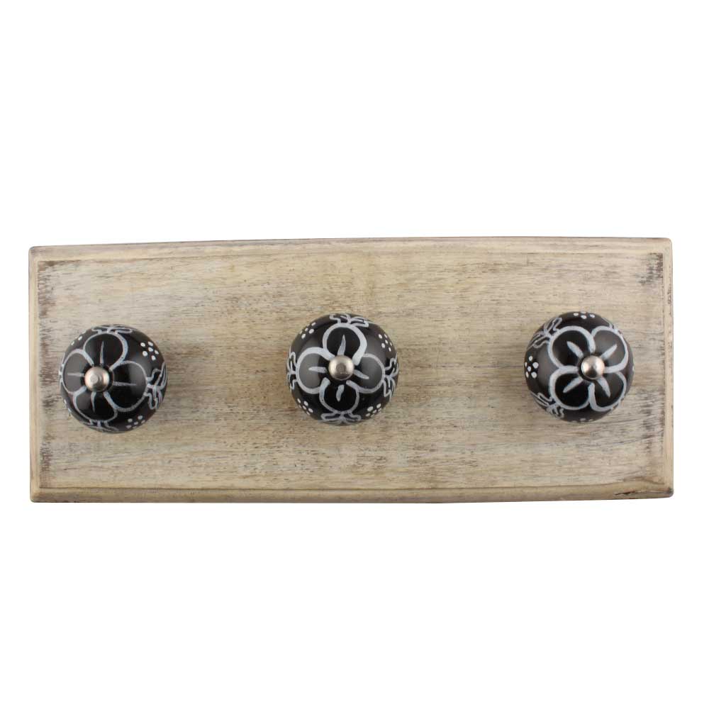 Material: Solid Natural wood base with hand-painted ceramic knob Finish: Glossy black glaze with floral detailing; sealed natural wood Installation: Hidden screw mount with included anchors and hardware