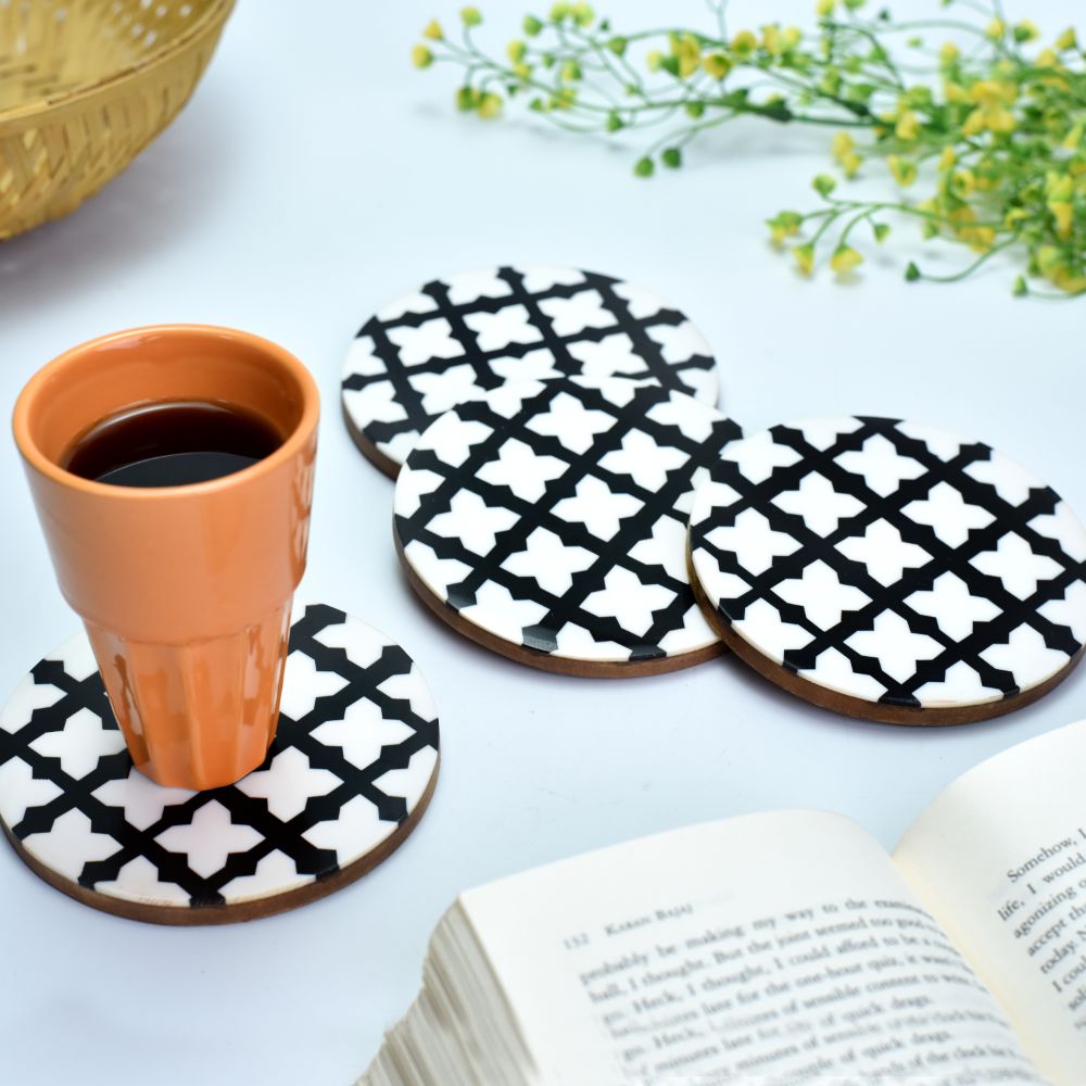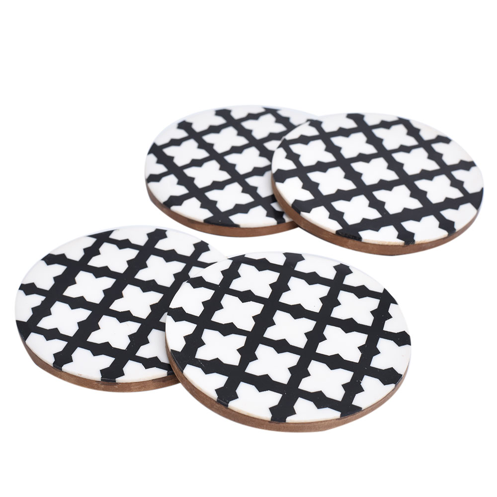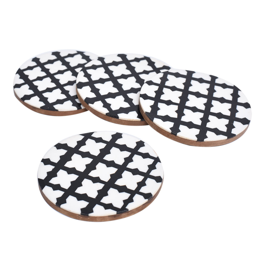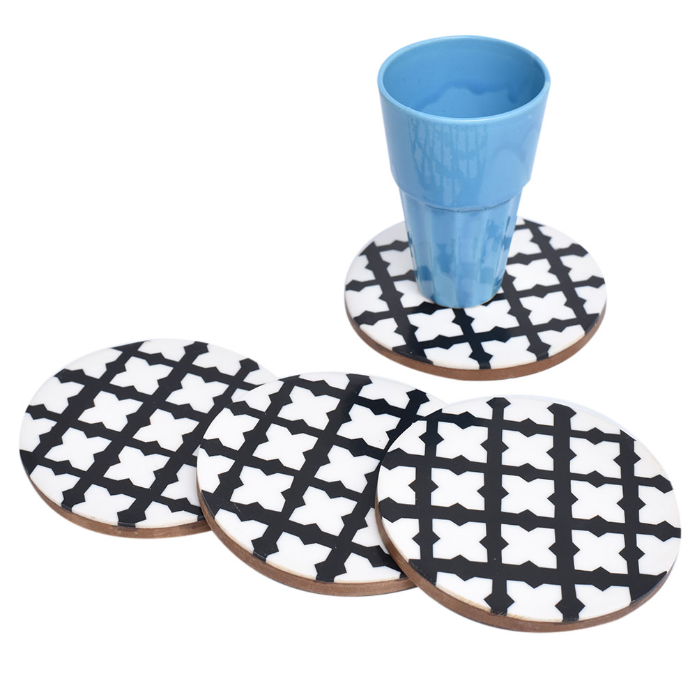The Moroccan design wood and resin coaster set of four is intended to elevate any dining experience at home, whether it is an informal or formal dinner arrangement with friends. Place glasses and bottles on the coaster to avoid leaving watermarks, stains, or spills on your table top. The classic black and white coaster set of four with a wooden undersurface would also make an excellent housewarming gift.