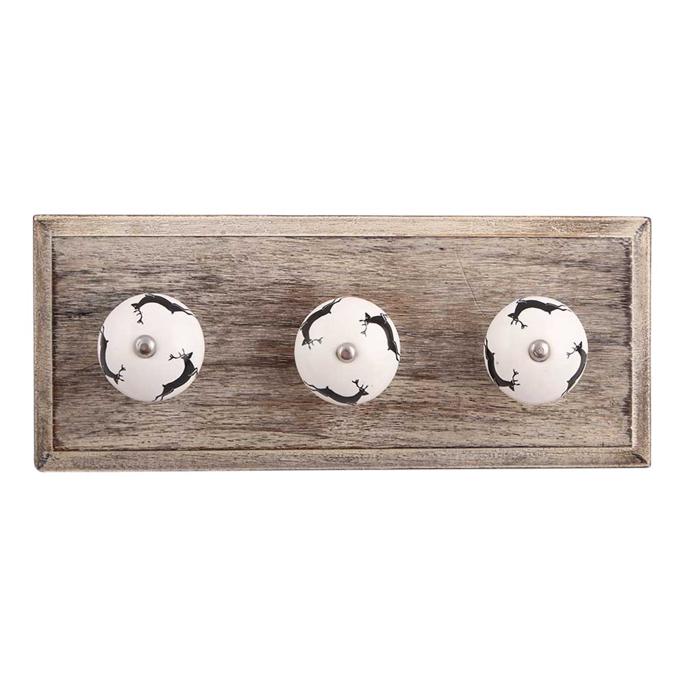 Black Running Rein Deer Pattern Ceramic Wooden Hook. A Perfect Complement to the Soft Tone of the Wood are these White Traditional Hat & Coat Hook Made of Genuine Porcelain and Brass. It can be use to Hang Jewellery, Leashes, Towels, Scarves, Light Weight Sweaters, Caps Etc.