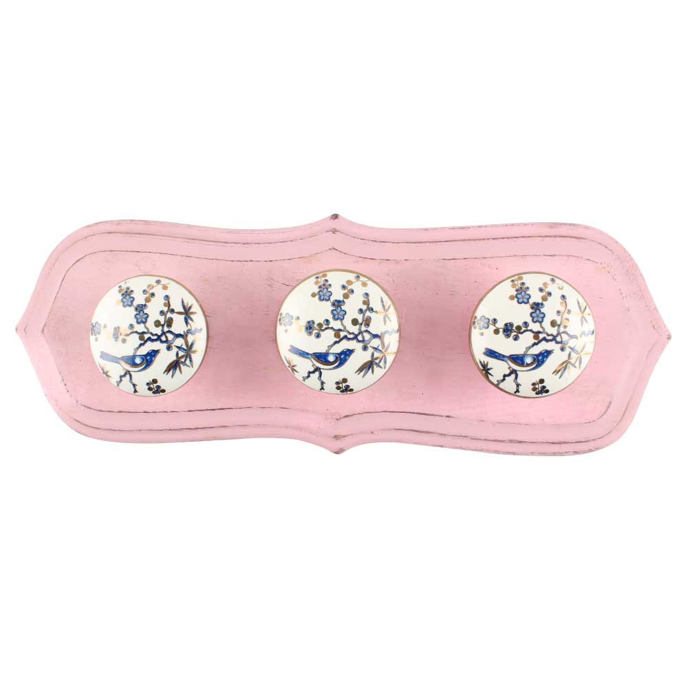 Blue Bird Golden Berry Ceramic Hook With Pink Painted Wooden. A Perfect Complement to the Soft Tone of the Wood are these White Traditional Hat and Coat Hook Made of Genuine Porcelain. It can be use to Hang Jewellery, Leashes, Towels, Scarves, Light Weight Sweaters, Caps etc.