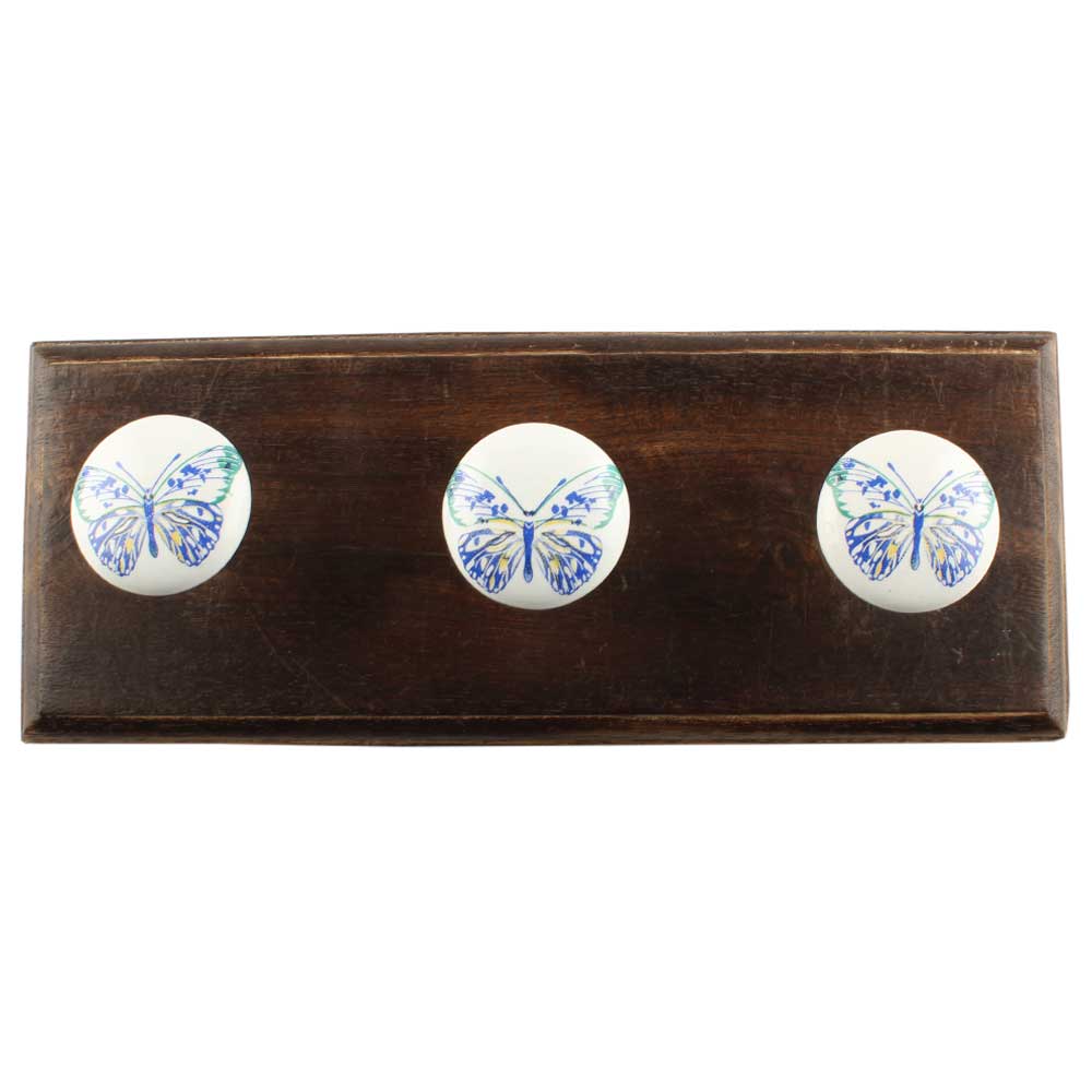 Blue Butterfly Ceramic Wooden Hook. A Perfect Complement to the Soft Tone of the Wood are these White Traditional Hat and Coat Hook Made of Genuine Porcelain and Brass. It can be used to Hang Jewelry, Leashes, Towels, Scarves, Light Weight Sweaters, Caps etc.