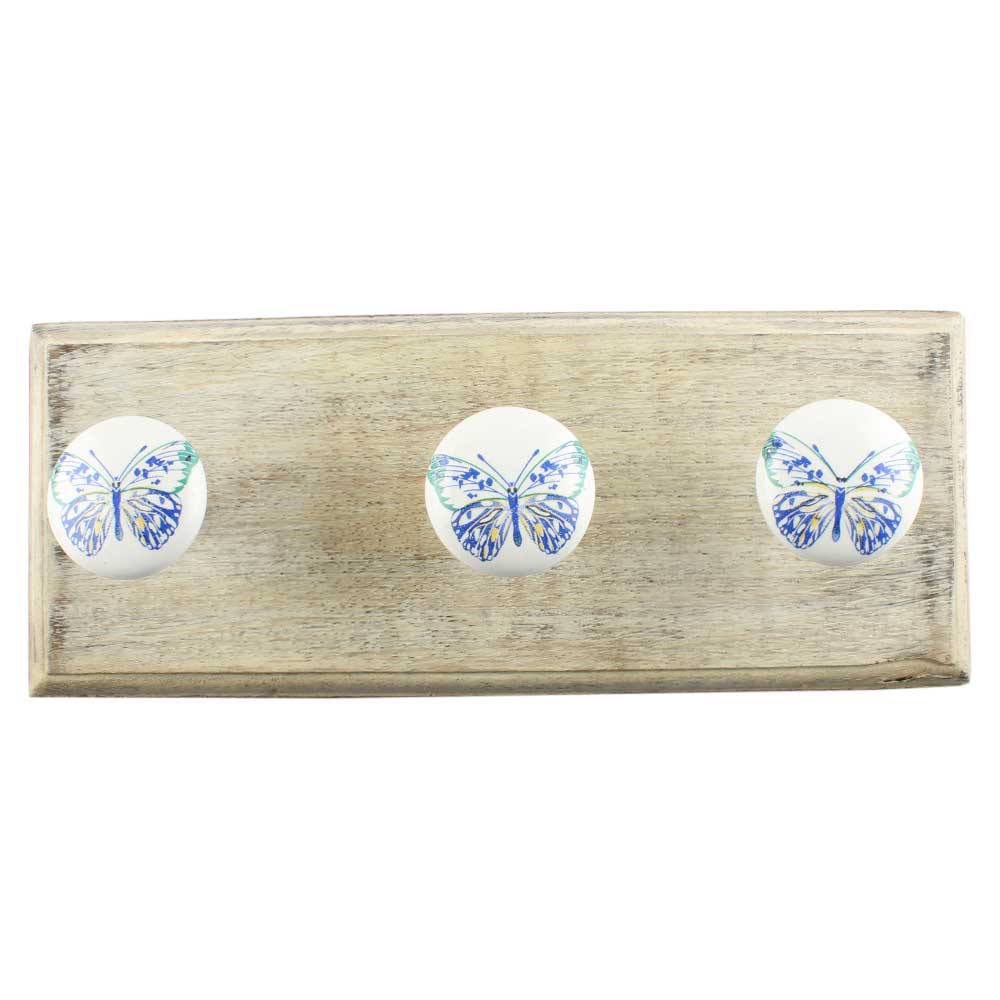 Blue Butterfly Ceramic Wooden Hook. A Perfect Complement to the Soft Tone of the Wood are these White Traditional Hat and Coat Hook Made of Genuine Porcelain and Brass. It can be used to Hang Jewelry, Leashes, Towels, Scarves, Light Weight Sweaters, Caps etc.