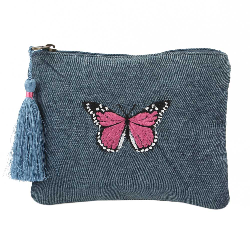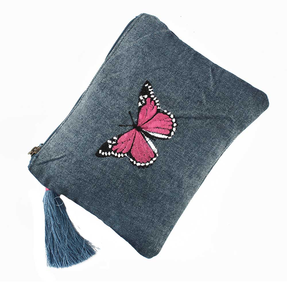 Blue Butterfly embroidered denim zip top cutch bag is perfect for shopping, gym, work, school and vacation.