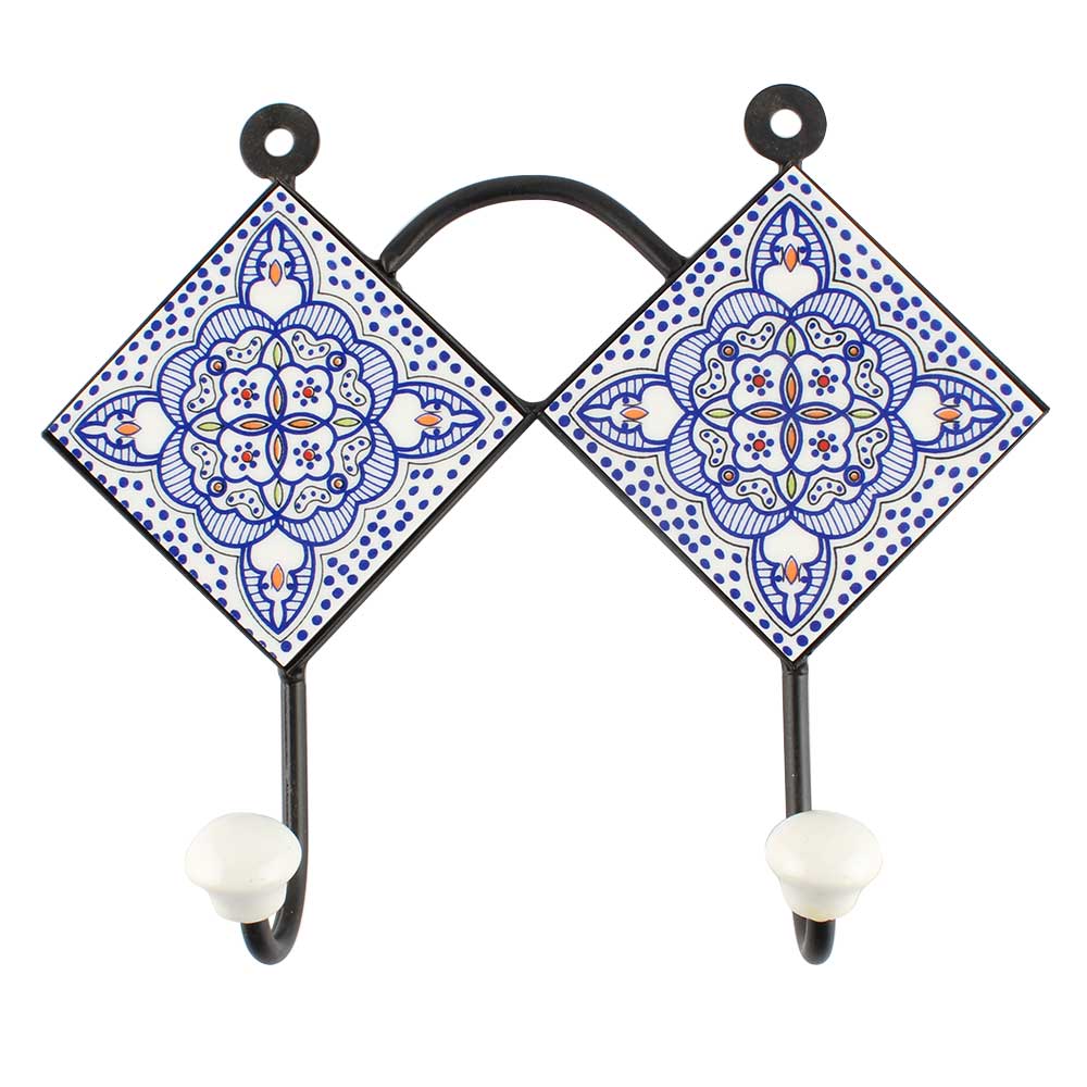 Blue Ceramic Floral Tile Hook. When Put on Wall or Cabinet It is An Art in Itself. The Metal Part of this Hook is Black Powder Coated.