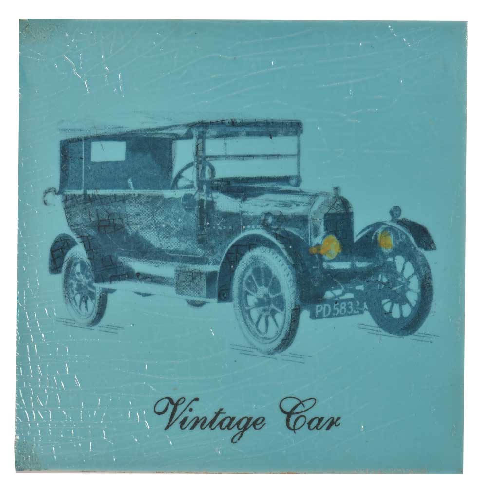This tile is blue in colour with a black vintage car painted on it, is made of ceramic. This tile has fine cracks (developed over the time period) which adds a vintage touch to it.
