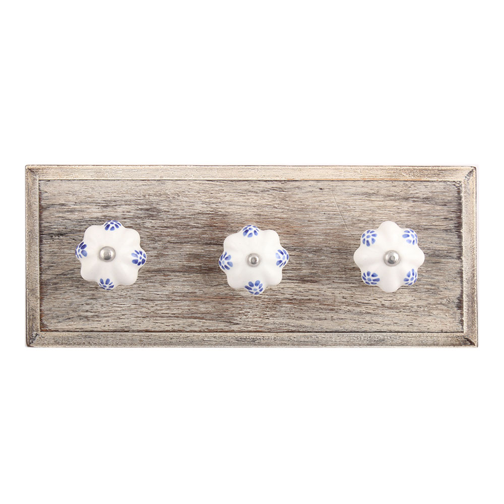 Blue Dahalia Medium Ceramic Wooden Hook. A Perfect Complement to the Soft Tone of the Wood are these White Traditional Hat & Coat Hook Made of Genuine Porcelain and Brass. It can be use to Hang Jewellery, Leashes, Towels, Scarves, Light Weight Sweaters, Caps Etc.