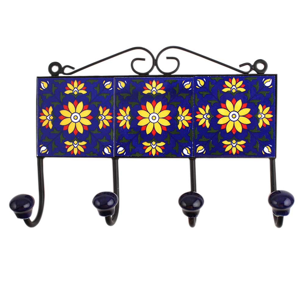 Blue Floral Ceramic Tiles Hooks-453 (Set Of Ine Piece)