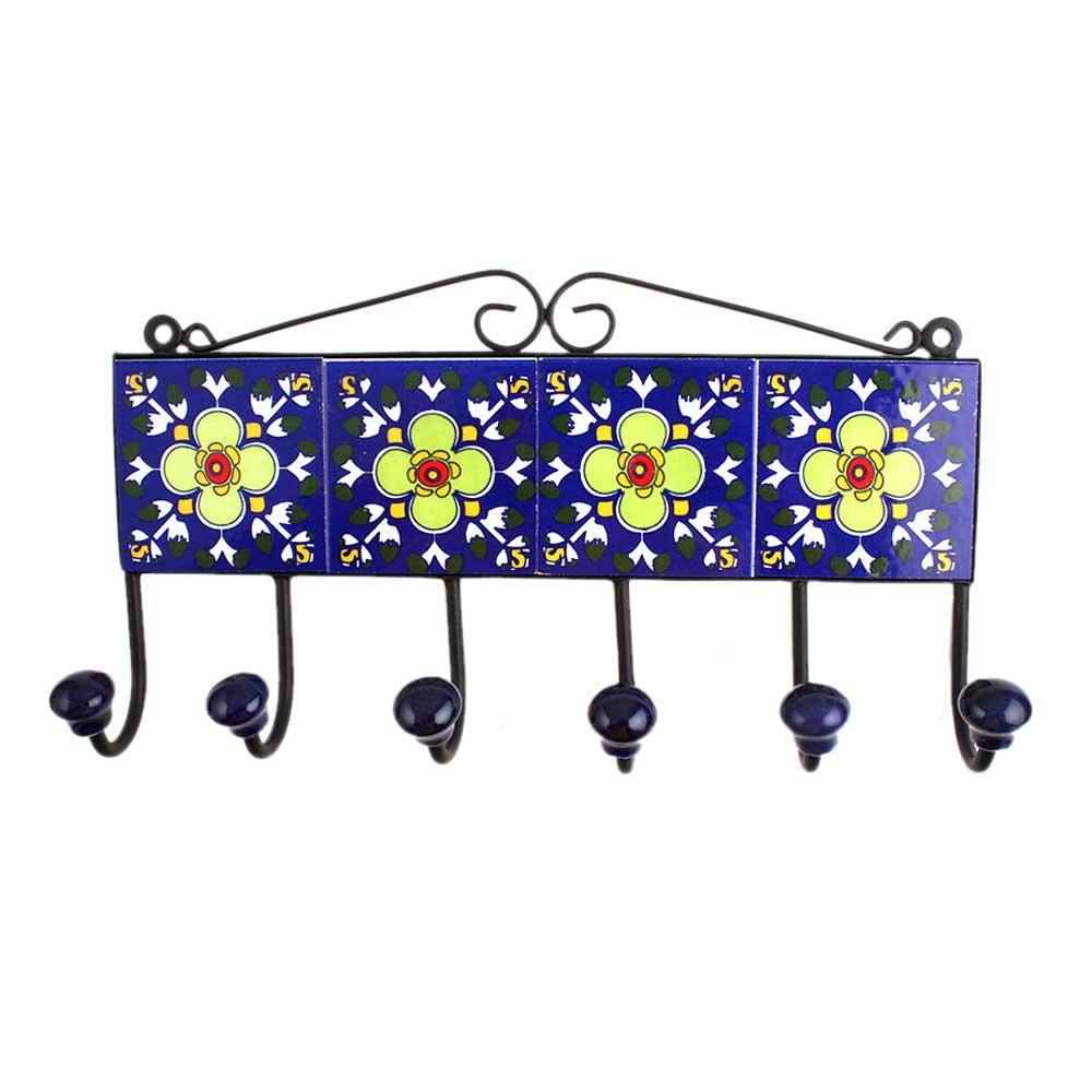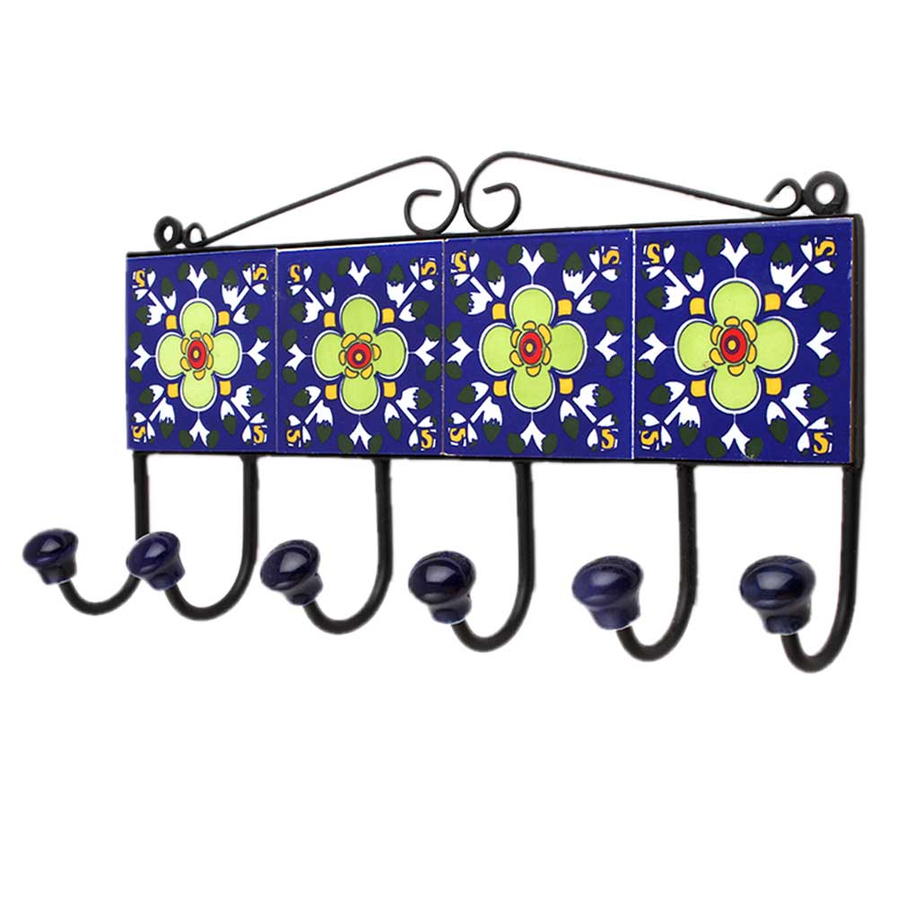 Blue Floral Ceramic Tiles Hooks. When put on wall or cabinet it is an art in itself. The metal part of this hook is black powder coated.