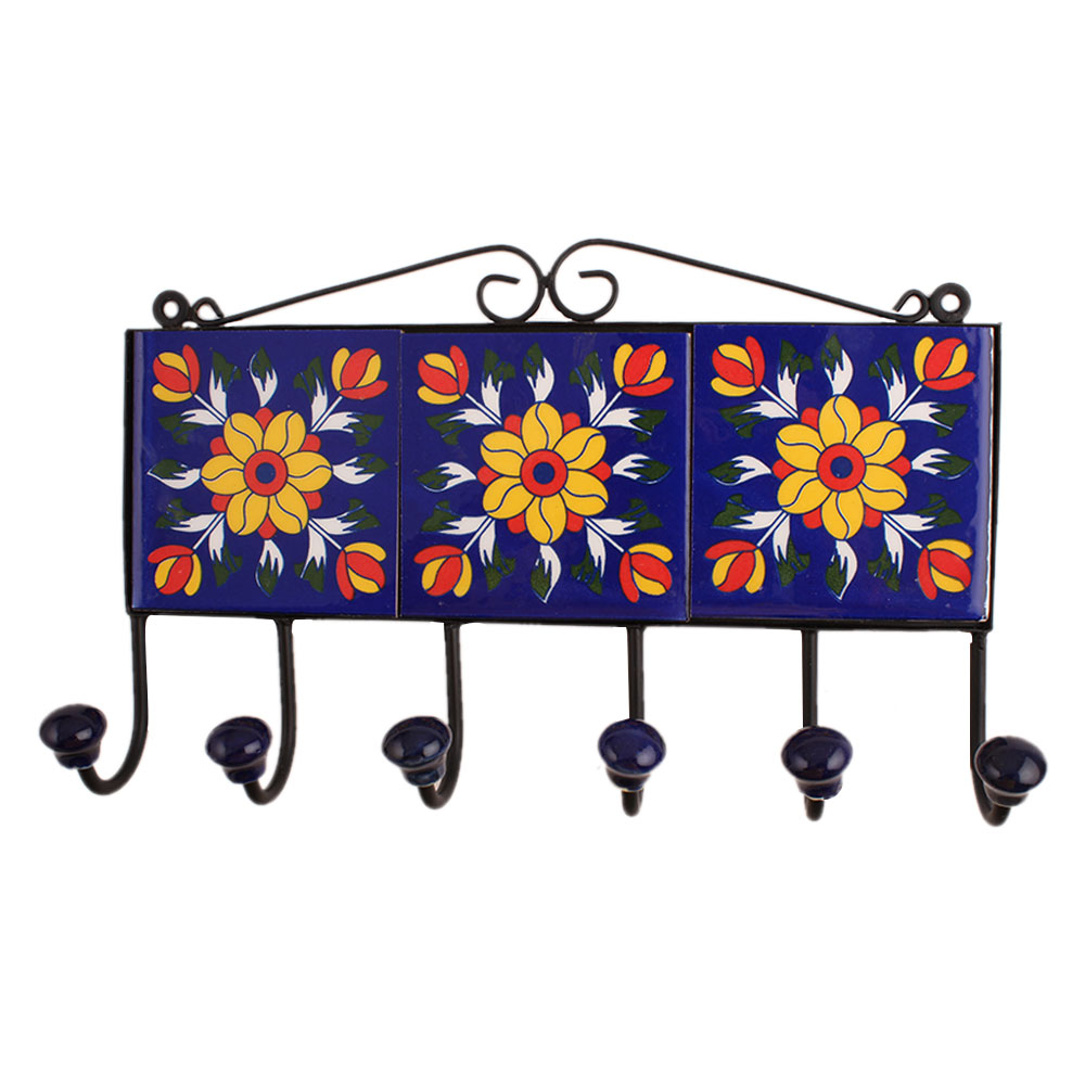 Blue Floral Ceramic Tiles Hooks. When put on wall or cabinet it is an art in itself. The metal part of this hook is black powder coated.