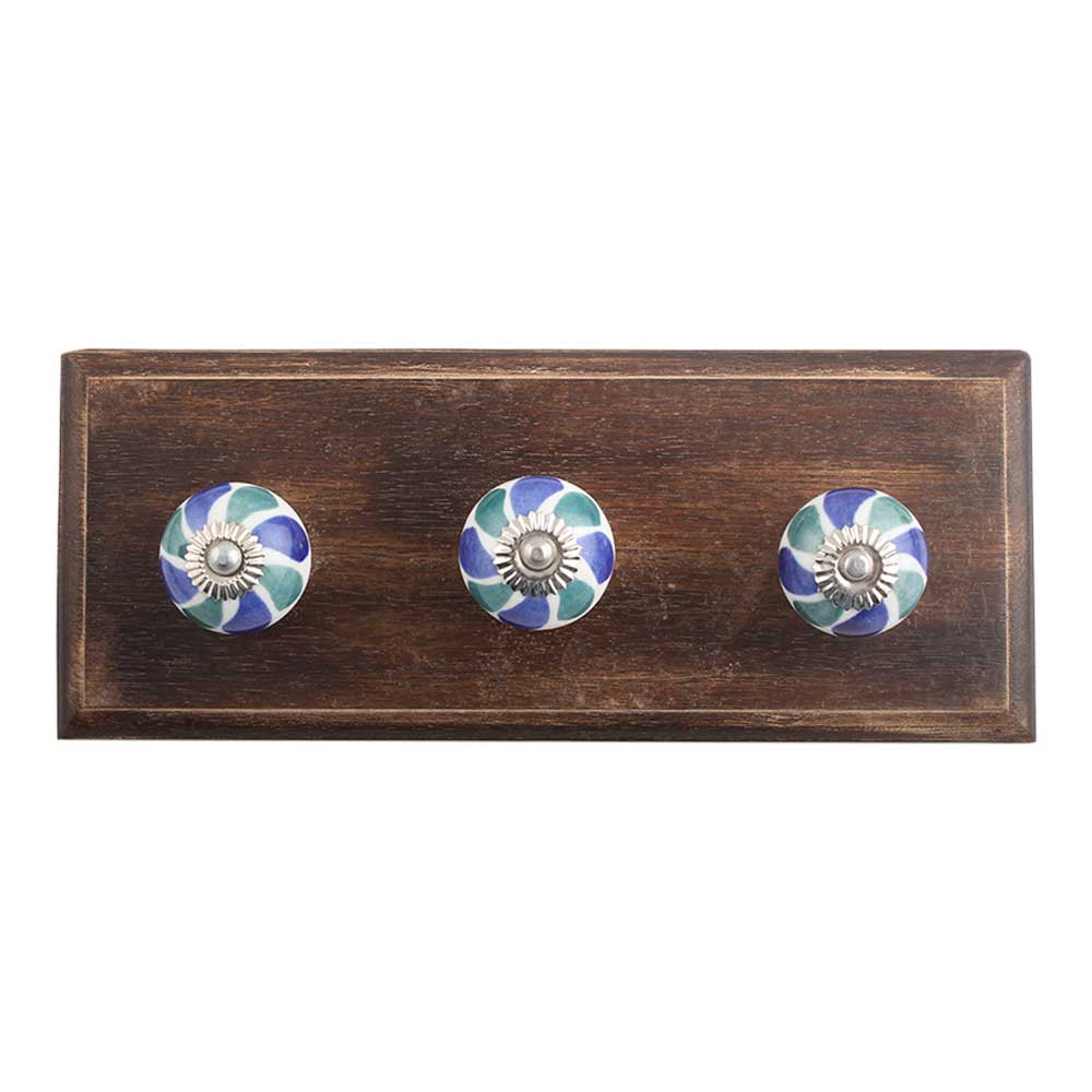 Blue Green Flower Ceramic Wooden Hook. A Perfect Complement to the Soft Tone of the Wood are these White Traditional Hat & Coat Hook Made of Genuine Porcelain and Brass. It can be use to Hang Jewellery, Leashes, Towels, Scarves, Light Weight Sweaters, Caps Etc.