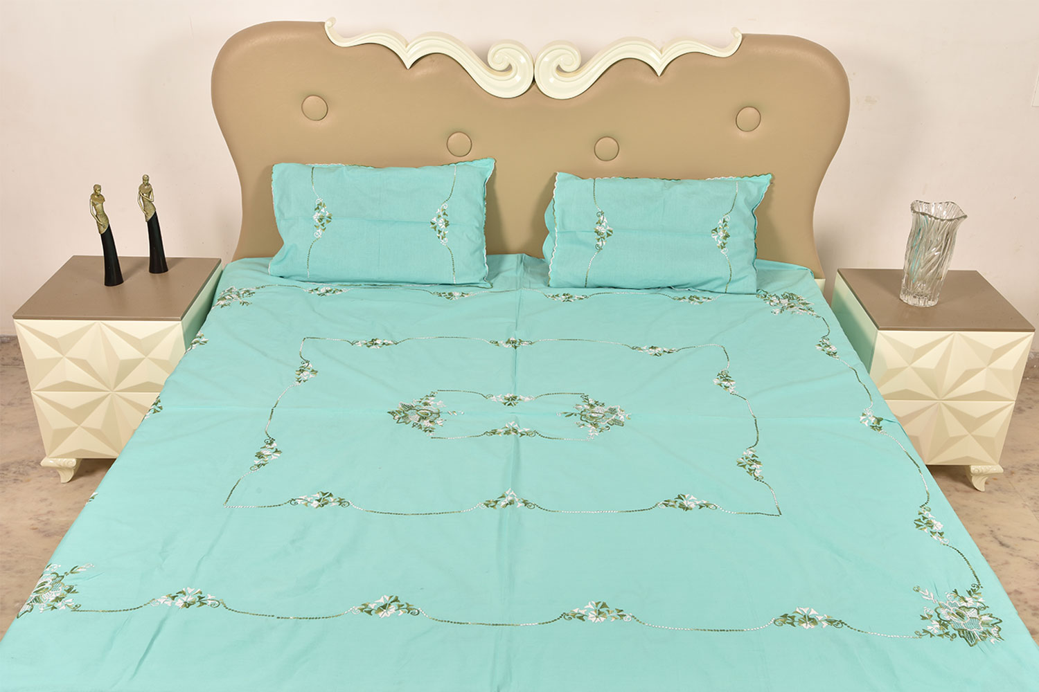 Blue Bed Linen with Floral Design . Hand crafted supporting eye capturing designs and colours.