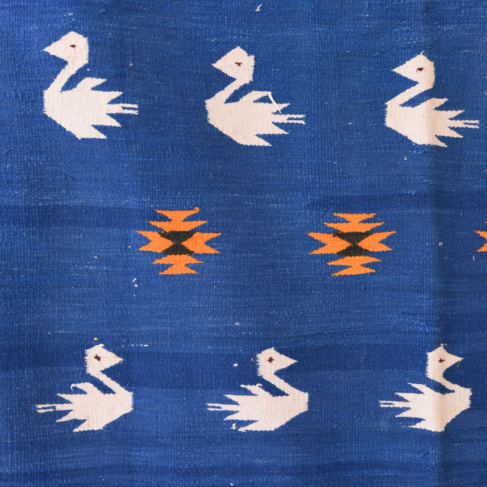 Blue Handmade Durry With Floral Duck Design With Orange Border.