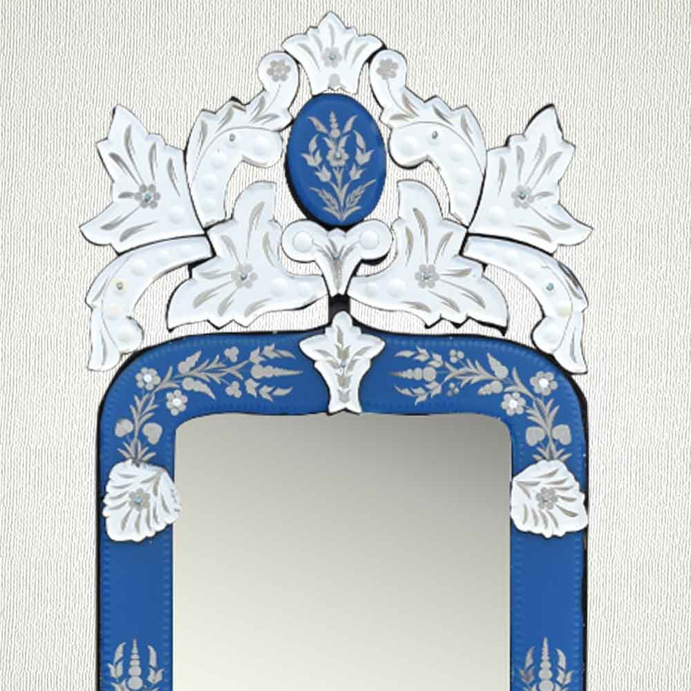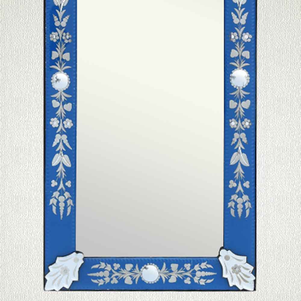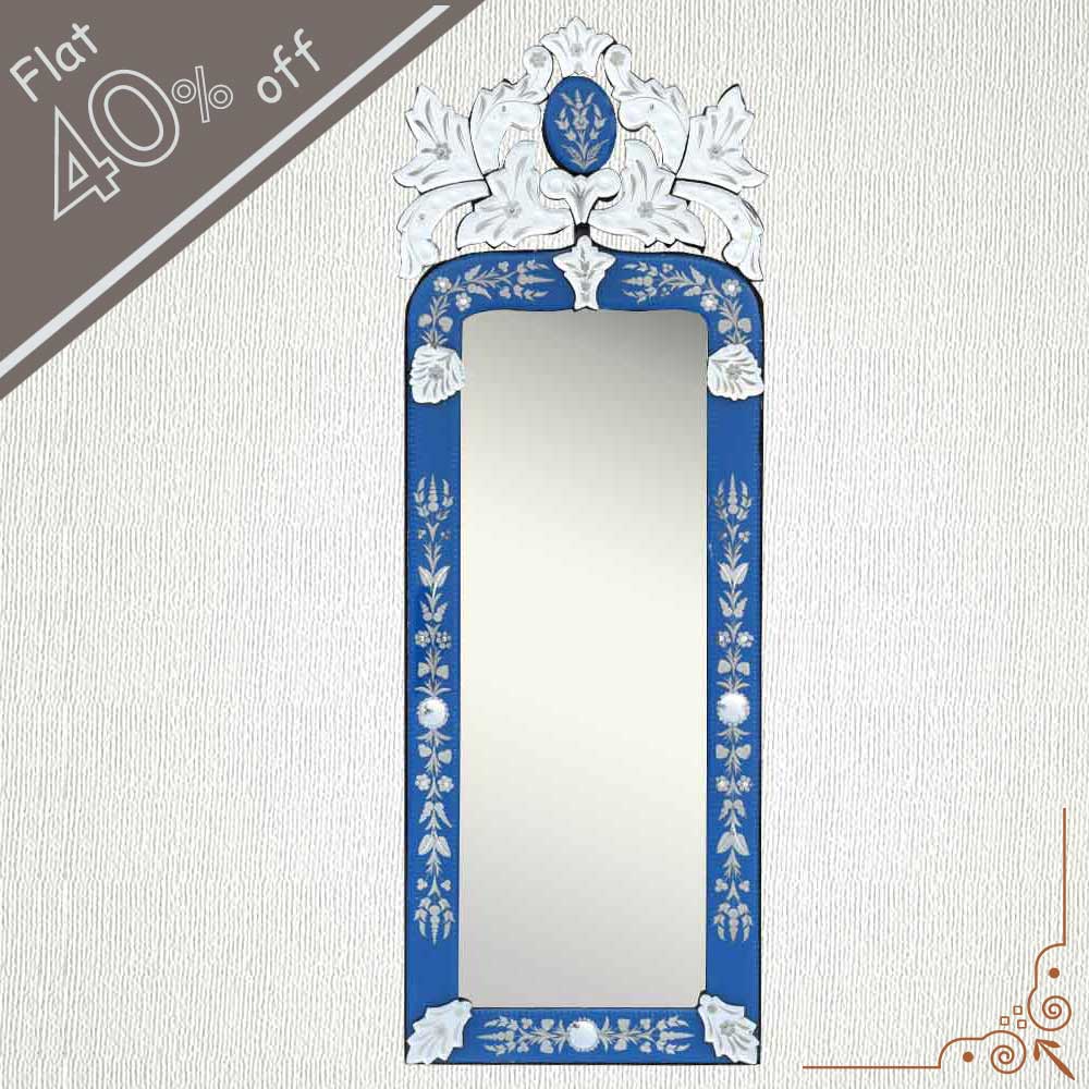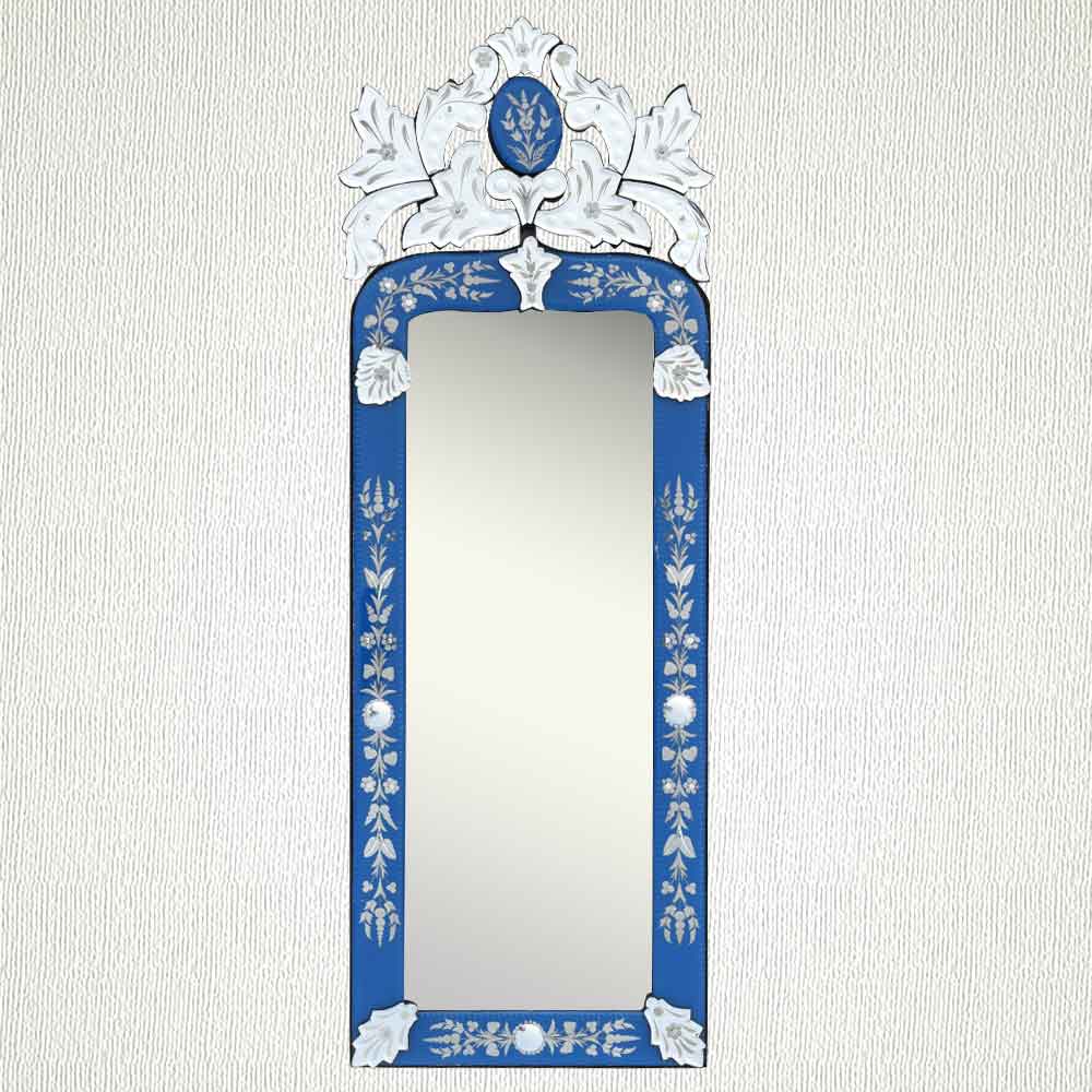 Blue Long Venetian Mirror-46.5 inches X 16 inches. A simple way to incorporate an elegant look into any room is the addition of Venetian mirrors these treasured pieces reflect light and serve as an artistic focal point transforming a room into a glamorous environment with a bit of old world elegance.