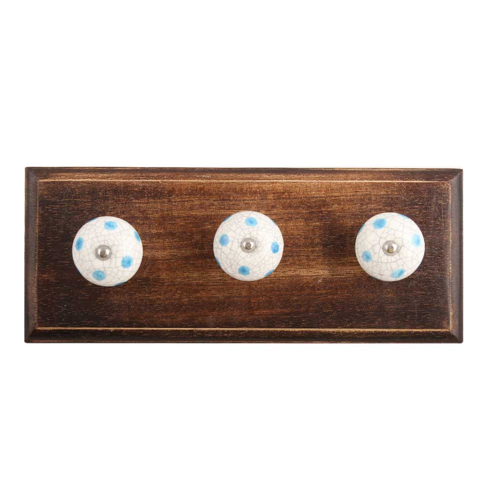 Blue Polka Dot Crackle Ceramic Wooden Hook. A Perfect Complement to the Soft Tone of the Wood are these White Traditional Hat & Coat Hook Made of Genuine Porcelain and Brass. It can be use to Hang Jewellery, Leashes, Towels, Scarves, Light Weight Sweaters, Caps Etc.