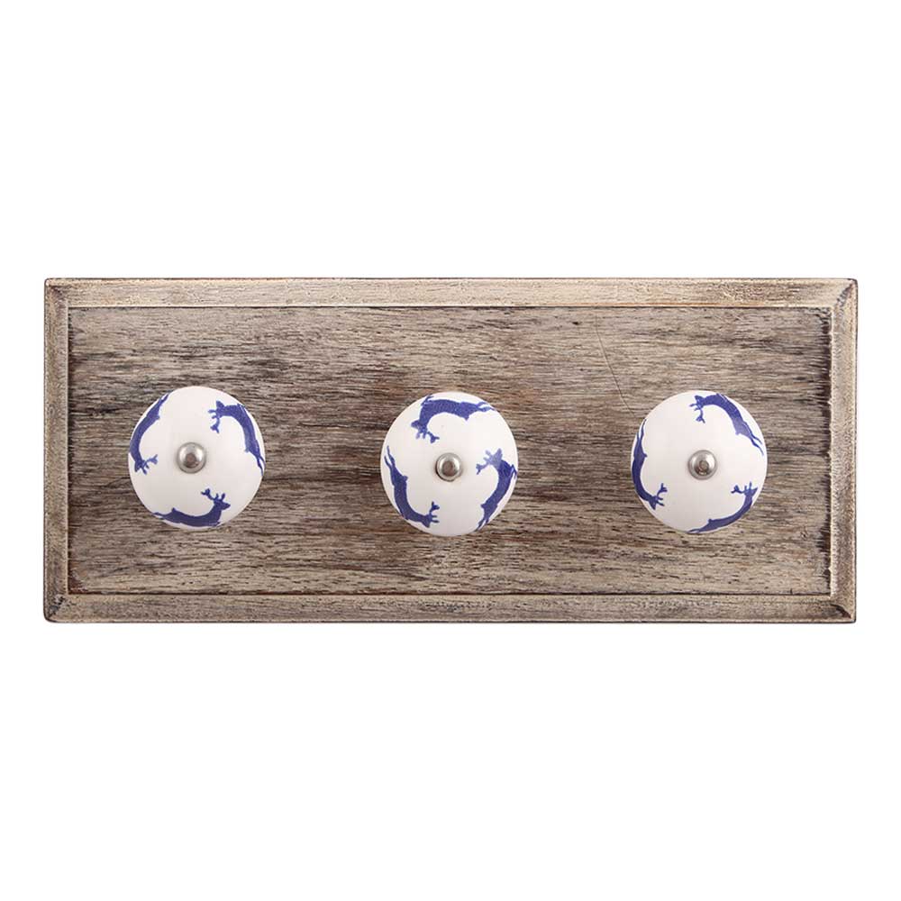 Blue Running Rein Deer Pattern Ceramic Wooden Hook. A Perfect Complement to the Soft Tone of the Wood are these White Traditional Hat & Coat Hook Made of Genuine Porcelain and Brass. It can be use to Hang Jewellery, Leashes, Towels, Scarves, Light Weight Sweaters, Caps Etc.