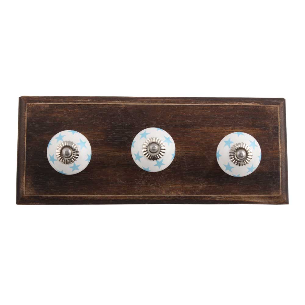 Blue Star Ceramic Wooden Hook. A Perfect Complement to the Soft Tone of the Wood are these White Traditional Hat & Coat Hook Made of Genuine Porcelain and Brass. It can be use to Hang Jewellery, Leashes, Towels, Scarves, Light Weight Sweaters, Caps Etc.