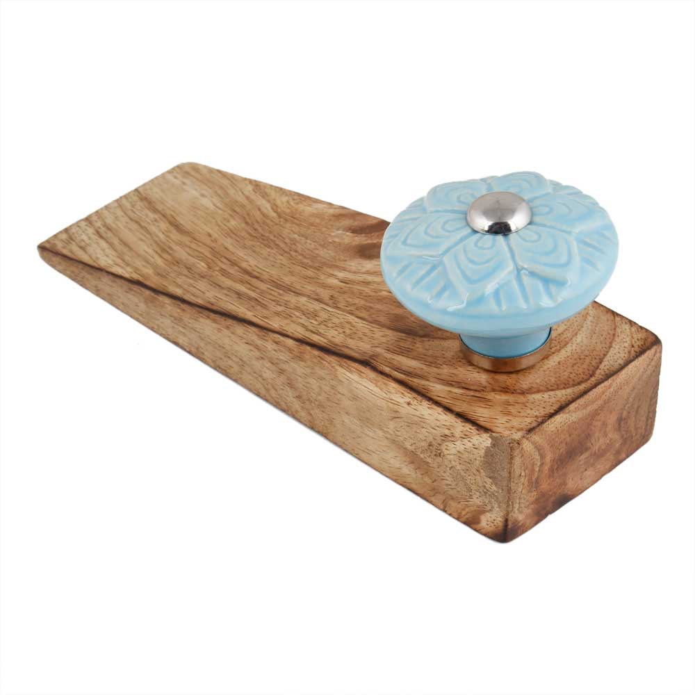 Blue Wheel Flower Ceramic Wooden Door Stopper.Wooden Door Stopper with a Ceramic Knob to Carry it Easily. This Wooden Door Stopper has Glue Dots under it to Ensure that it does not Slip. It is Handmade by the Craftsmen of India and this Innovative Door Stopper won't Disappoint You.