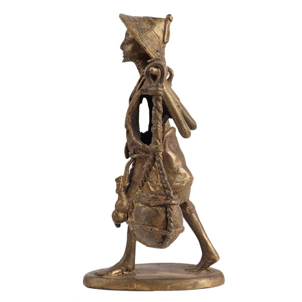 This brass showpiece depicts an African man carrying water. Popular as a classic rural water carrier figure With a desirable aged patina. The brass figurine exhibits excellent weathering and dark, natural hues . The man walks with a pair of large buckets in a wide yoke. His face is a cheerful sight as he wears a jaunty hat and his long flowing robe billows over his slender frame. Standing on a circular base with a foliate pattern around the perimeter. This is a lovely antique decorative figure with beautiful rural African imagery.