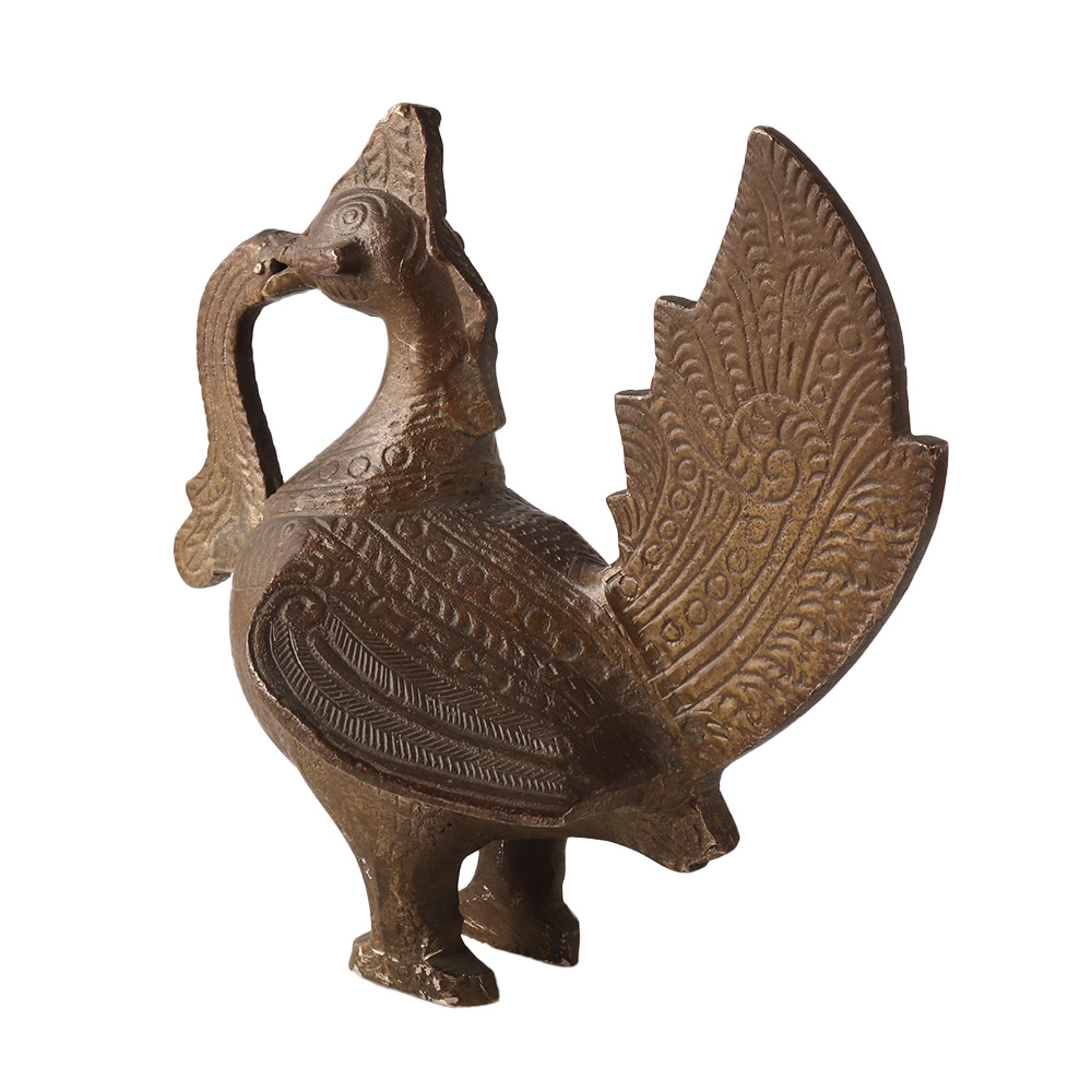 Tamil Nadu is the home of this exquisite and intricate statue of Annapakshi that is perched atop a tiny wooden block. A mysterious white bird known as Annapakshi, it has the body and beak of a swan and the stunning plumage of a peacock. It's thought to live in heaven. The bird is typically shown holding a flowering vine in its beak, which represents abundance. Annapakshi is a symbol of grace and purity as well. It is thought that if a bird is given a mixture of water and milk, it can separate the milk from the water, symbolizing choosing truth over falsehood. In addition, it is a very common motif throughout all of South India, appearing on textiles, objects, diyas, and more. This brass Annapakshi will give your home's decor a touch of tradition.