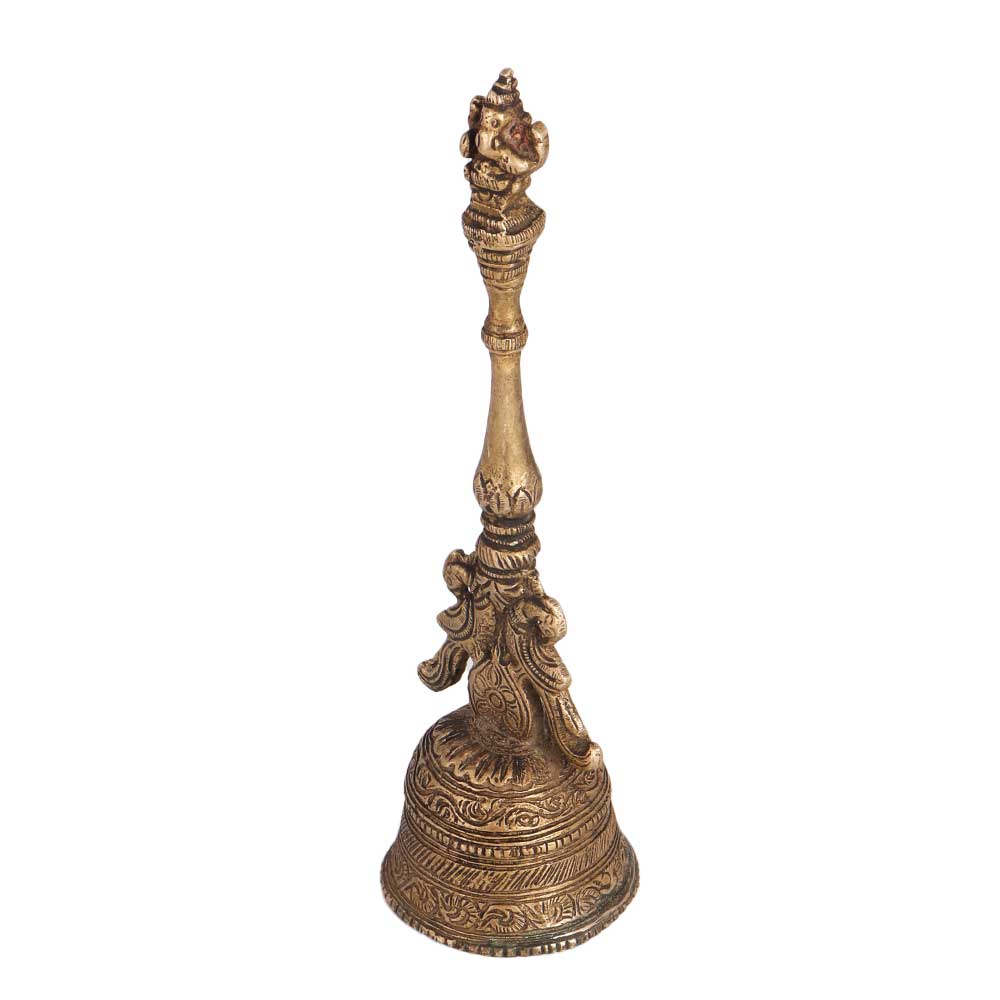 A vintage bell used in temples during morning and evening prayers to produce a soothing sound that relaxes the believer's mind and helps him focus on the deity. It is made of high quality brass and engraved with a beautiful design that makes it an eye-catcher for your visitors and guests. This bell is carved with the statue of Lord Ganesha on the top. Lord Ganesha is one of the most important deities in Hinduism and is worshipped before the beginning of new venture. You can use this auspicious temple bell during havan, pooja, ritual or in the temple during prayers. A brass bell as a gift on special and festive occasions for your loved ones.