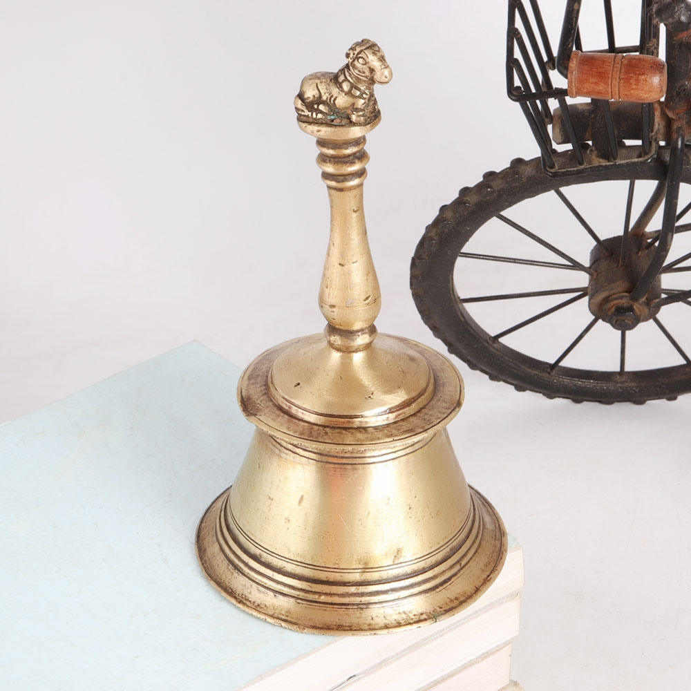 Buy a brass bell online from our website, which is made of high quality brass, making it a perfect piece for decoration and vintage collection. Being handcrafted by highly skilled and experienced Indian artisans, it leaves a long lasting impression in decoration. This brass temple bell is carved with Lord Nandi on the top, making it an auspicious bell to be used in rituals, havans and aarti. Lord Nandi is the bull Vahana of the Hindu God Lord Shiva and is worshipped in many Indian temples. Display this vintage bell in a museum, exhibition or collection of ancient art. An auspicious gift for a friend, family or relative on a special or festive occasion.