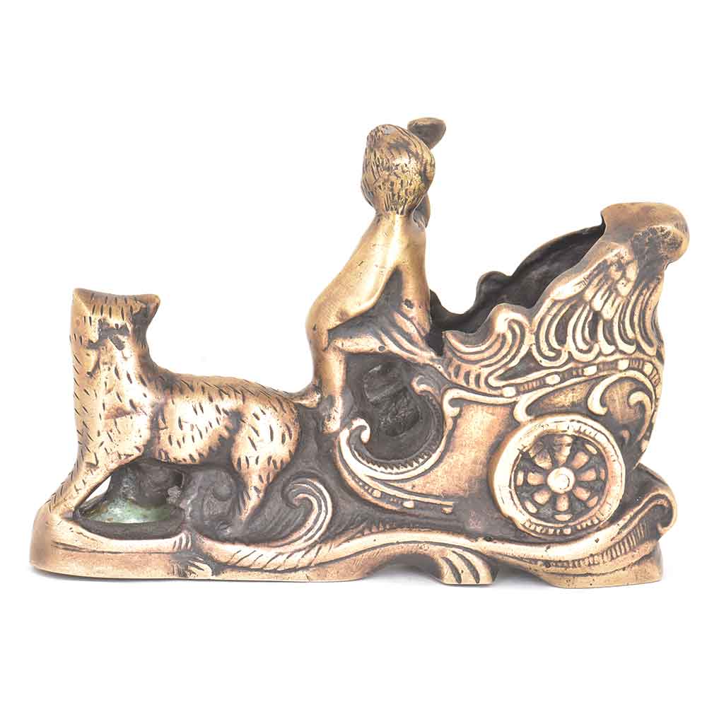 Handmade brass vintage carriage statue drawn by big cat which depicts that it is the property of the royal family a man is seen seated on the carriage making some kind of announcement with a loudspeaker in his hand with lovely engraved design on the carriage . Can be used as a pen holder, for gifting or a study table decor item.