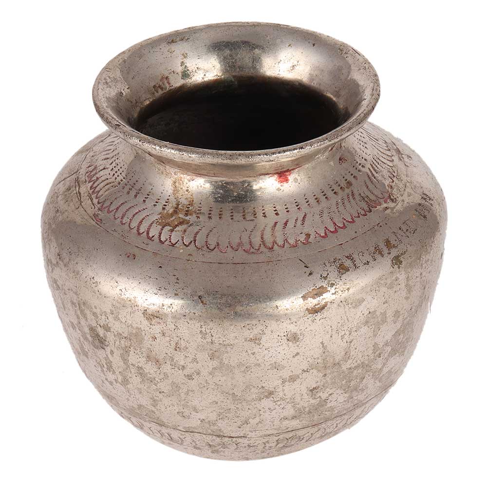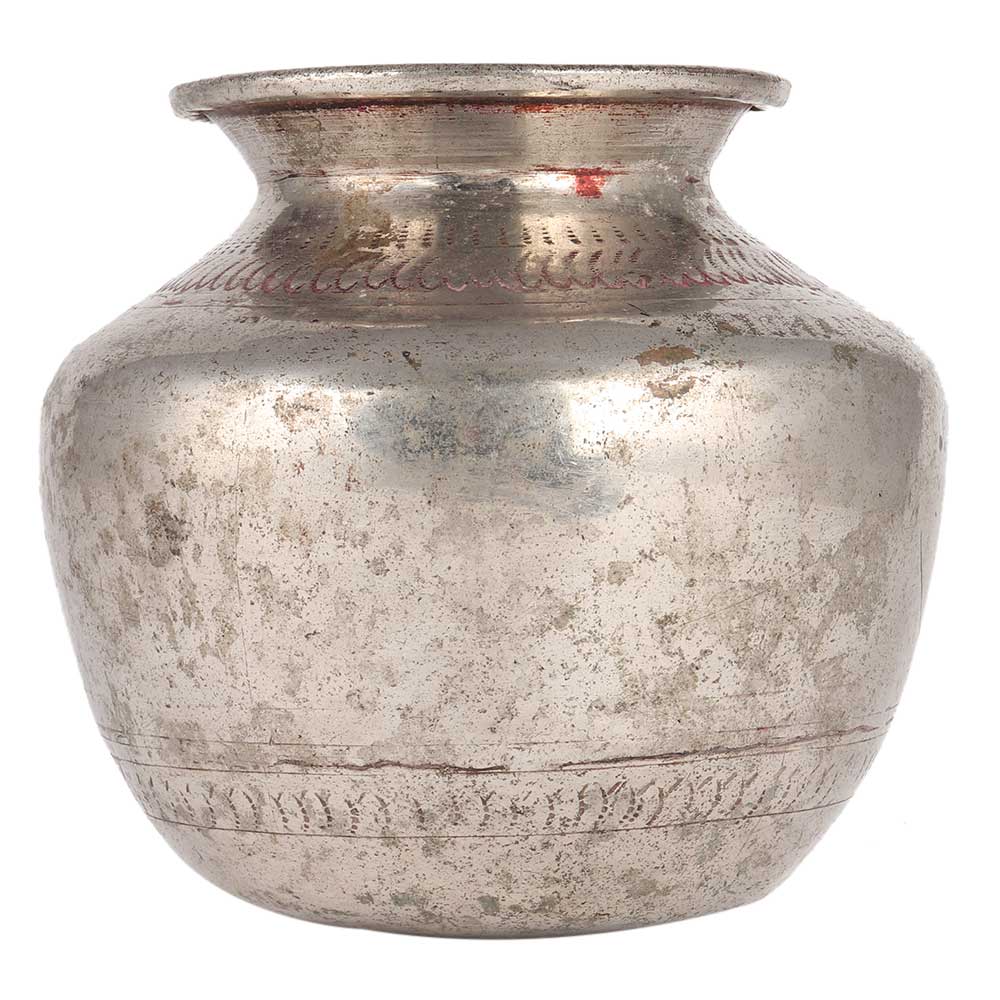 This beautiful Indian medieval pot made of solid brass is ideal for creating a boho-inspired interior design. This Indian tiny pot is used in home altars or religious sites and would add amazing charm to your home's living/dining space or kitchen. It comes with a lovely nickel finish.