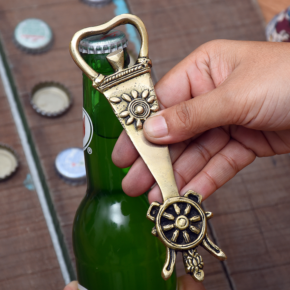 Made of solid brass functional and decorative piece unique piece this vintage design bottle opener with a golden brass finish is perfect for the kitchen or any bar area. Locate one in your home or outside for parties.