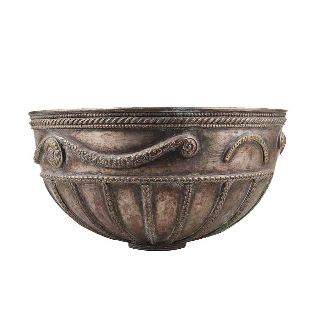 Hand chiseled brass bowl with embossed floral bands Mohan meakin limited embossed on it and logo made of eagle and lion on the either side of 125 in a bracket. Use it as a fruit bowl, showpiece, to display fresh flowers and plants, as a gift for near and dear ones in diwali, christmas new year and house warming.