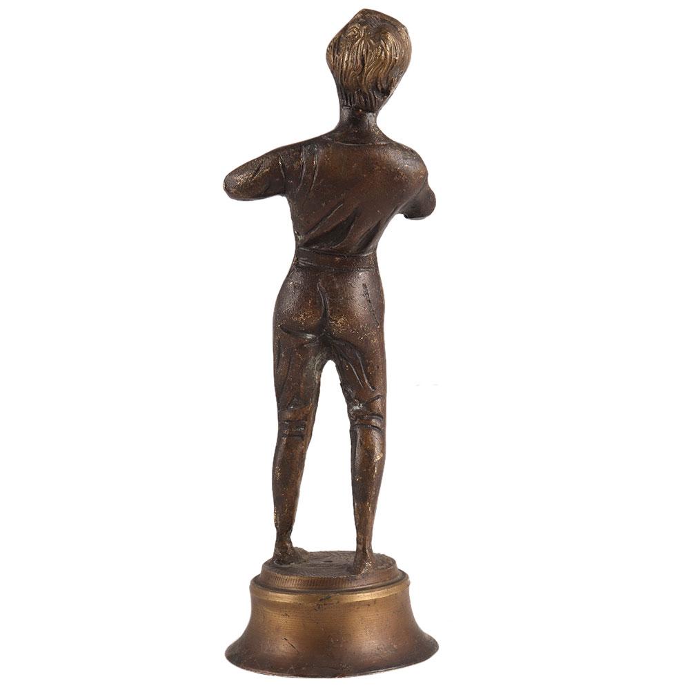 Brass statue of a boy playing the flute from the second half of the twentieth century. This boy used to be a hunter boy from World War I. He's not wearing any shoes, and it could be a scene of him playing the flute around displaced persons during the war.