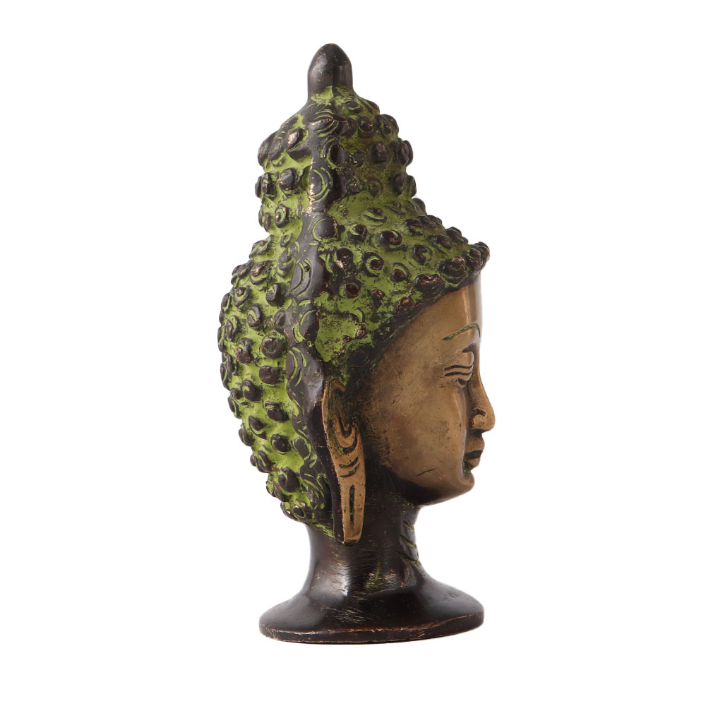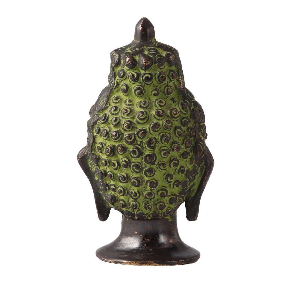 With this handcrafted brass Buddha head statue in green finish, you can bring peace and tranquility into your home. The cranial bump on Buddha's head represents Ushnisha, or special wisdom; Urna, a round tuft of hair between the brows, represents supernatural vision; and short curled hair represents nobility. This lovely Buddha is perfect for your home or as a gift. Handmade artwork with fine craftsmanship and a simple golden colour, suitable for any family's decoration style, and perfectly integrated into every corner of your home. It has a green finish.