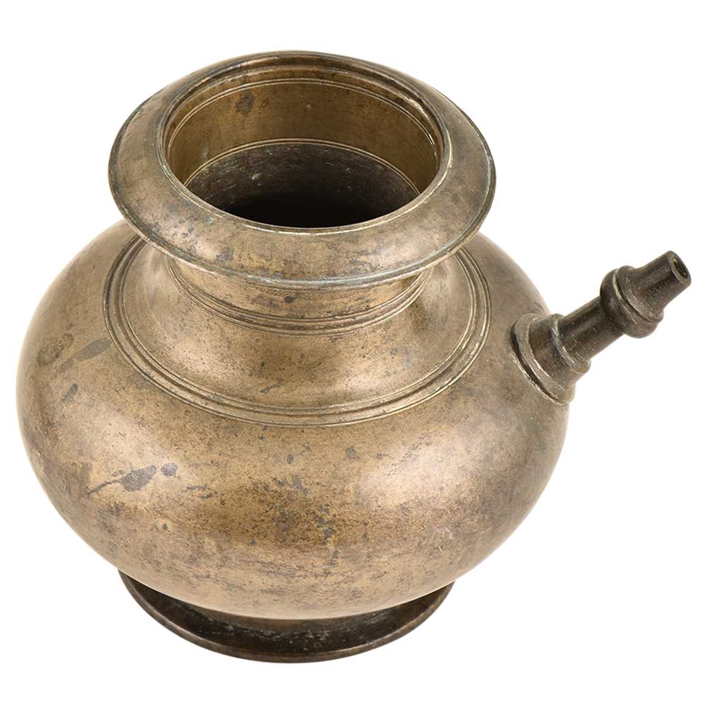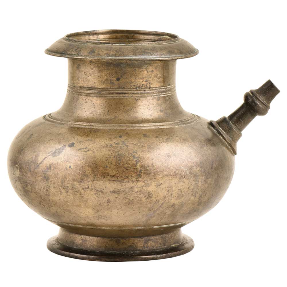 This hand crafted brass water pot with a spout is made by expert artisans of India . This brass pot has a bulbous body was filled with holy has a nice patina was used in temples and other religious places . It has a bottom rim for support an has a large belly to store water wit a spout that is attached to one side of the pot.