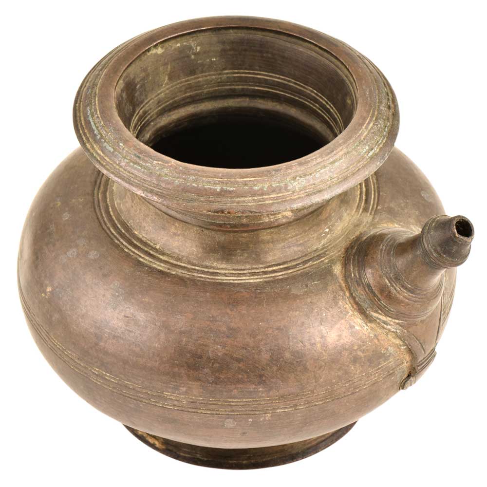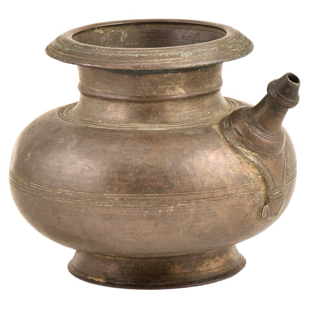 This hand Crafted Brass Water Pot with floral design on the Spout is made by expet artisans of India . This brass pot has a ribbed bulbous body was filled with holy has a nice patina was used in temples and other religious places . It has a bottom rim for support an has a large belly to store water wit a spout that is attached to one side of the pot.